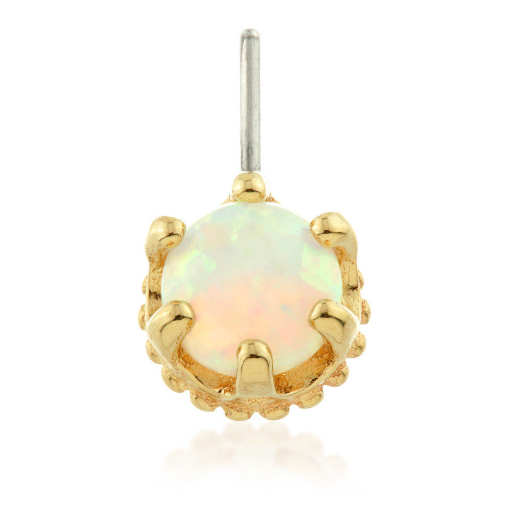 TISH LYON® - 14ct Threadless Gold Front Facing Opal Crown Pin Attachment Gauge: 1.2mm Size: 4mm Gold Colour: Yellow Opal Colour: White 316L Surgical Steel Pin Packaged in small grey presentation box/card Suitable for initial piercing