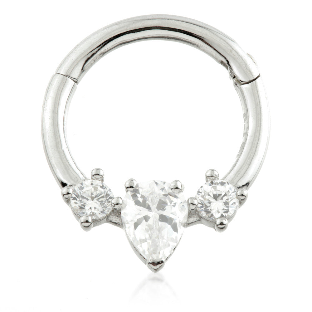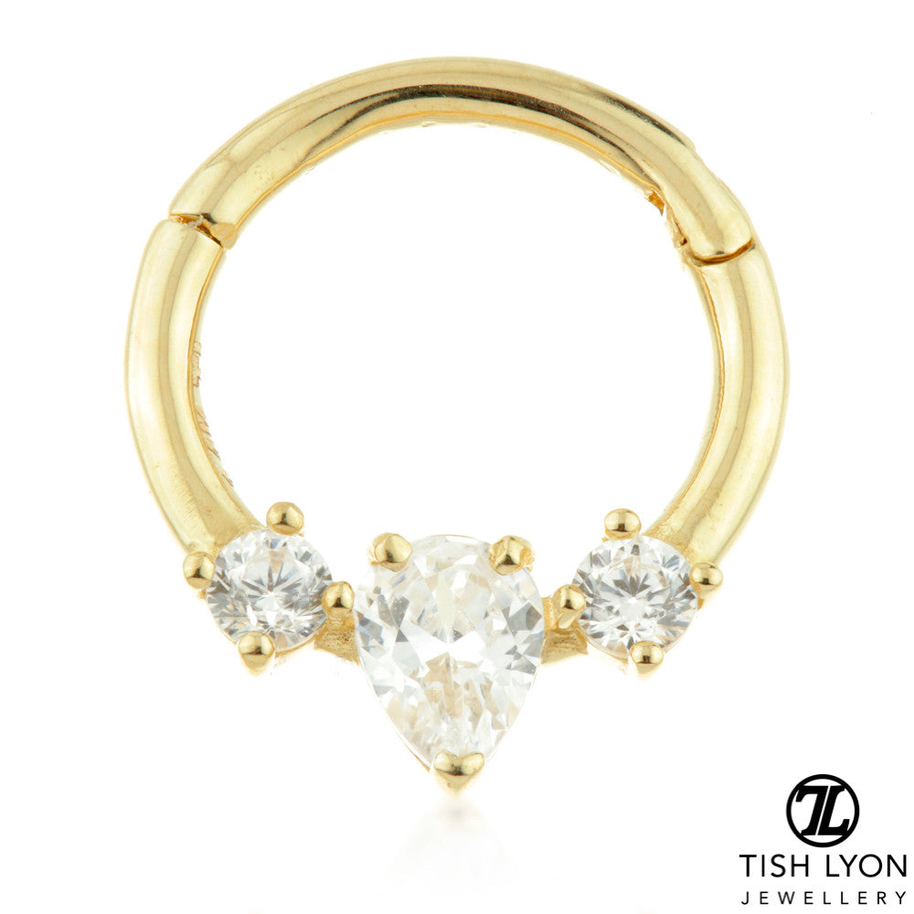 TISH LYON® - Gold CZ Tear Hinge Daith / Cartilage Ring 9ct or 14ct Yellow or White Gold For Septum, Cartilage, Tragus, etc Segment Ring Sizes: 1.2mm x 6mm / Weight 0.38gm / CZ R1.5mmx2/T3*2 1.2mm x 8mm / Weight 0.63gm / CZ R1.5mmx2/T4*3 14ct Suitable for initial piercing