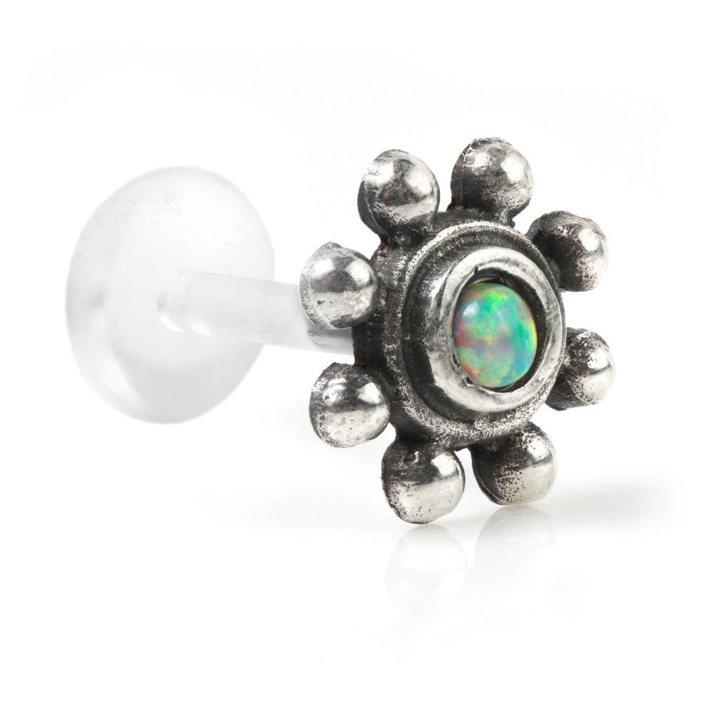 Ornate 925 Silver & Opal Attachment on Plastic Labret - Internal push in Gauge: 1.2mm / 16g Length: 6mm or 8mm Attachment Size: 6mm (approx) Not for initial piercing, only to be worn in healed piercings