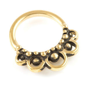 24ct Yellow Gold PVD on 316L Steel - Open by hand - Seamless Septum / Ear Rings in Bohemian designs Made from cast steel - annealed for easy opening Size: 1.2mm x 8/10mm Can also be worn through small tunnels