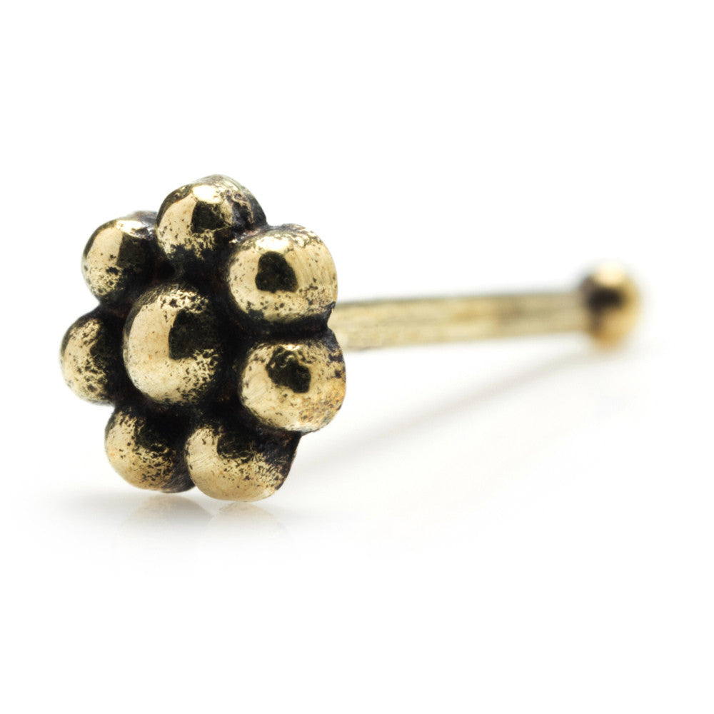 Brass Nose Bone with Flower Design Gauge: 0.8mm / 20ga Diameter of Top: 4mm Length of Stem: 7mm Only to be worn in healed piercings