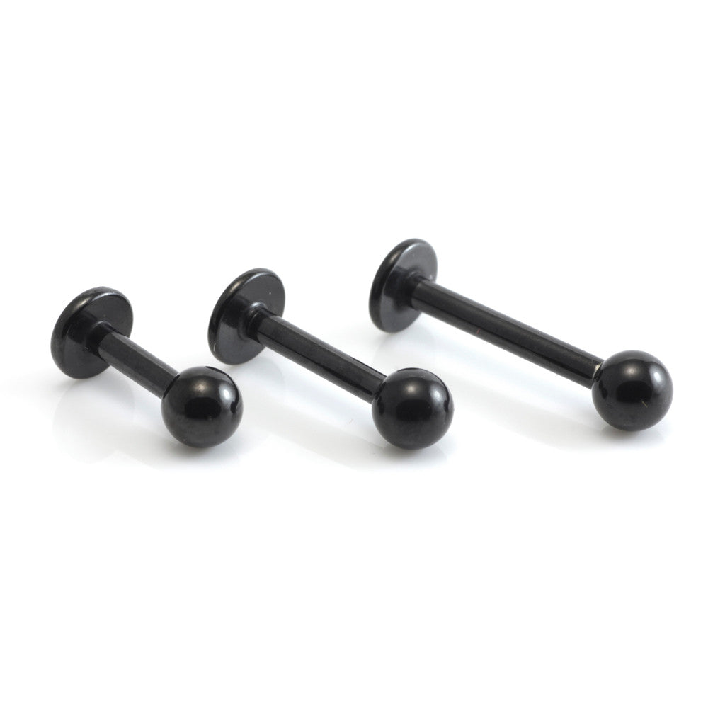 PVD Evil Black on Titanium Labret - Blackest Black Gauge: 1.2mm or 1.6mm Sizes: 5/6/7/8/9/10/12mm Ball Size: 3mm (on 1.2 gauge) or 4mm (on 1.6 gauge) Medical Grade Titanium 6Al-4VEli ASTM:F-136