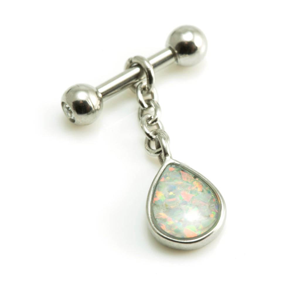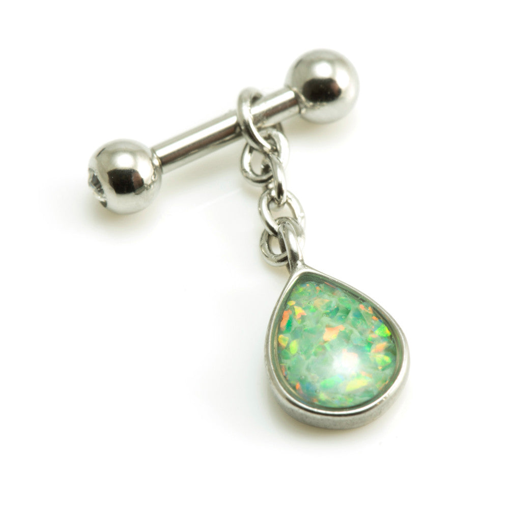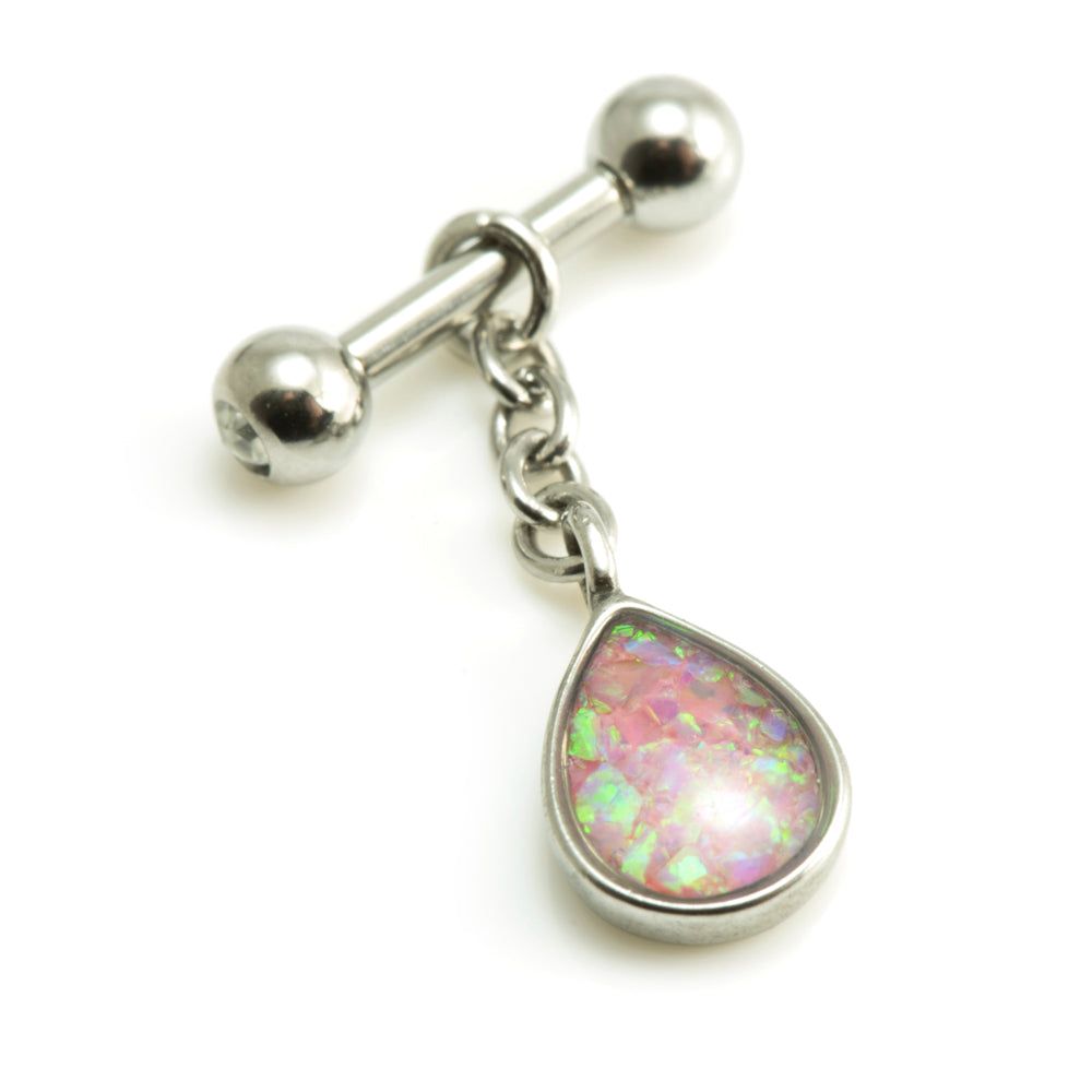 Synthetic Opal Hanging Tear on Crystal Gem Barbell Opal Colour: Pink / Green / White Gauge: 1.2mm Length: 6mm Tear Size: 5mm x 6mm