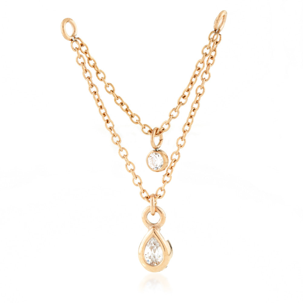 Rose Gold PVD Steel Double Hanging Gem Chain Charm Chain Length: 3cm Gem Size: Circle Gem (2mm), Tear Drop Gem (4x2mm) O-ring Inner Diameter: 2mm