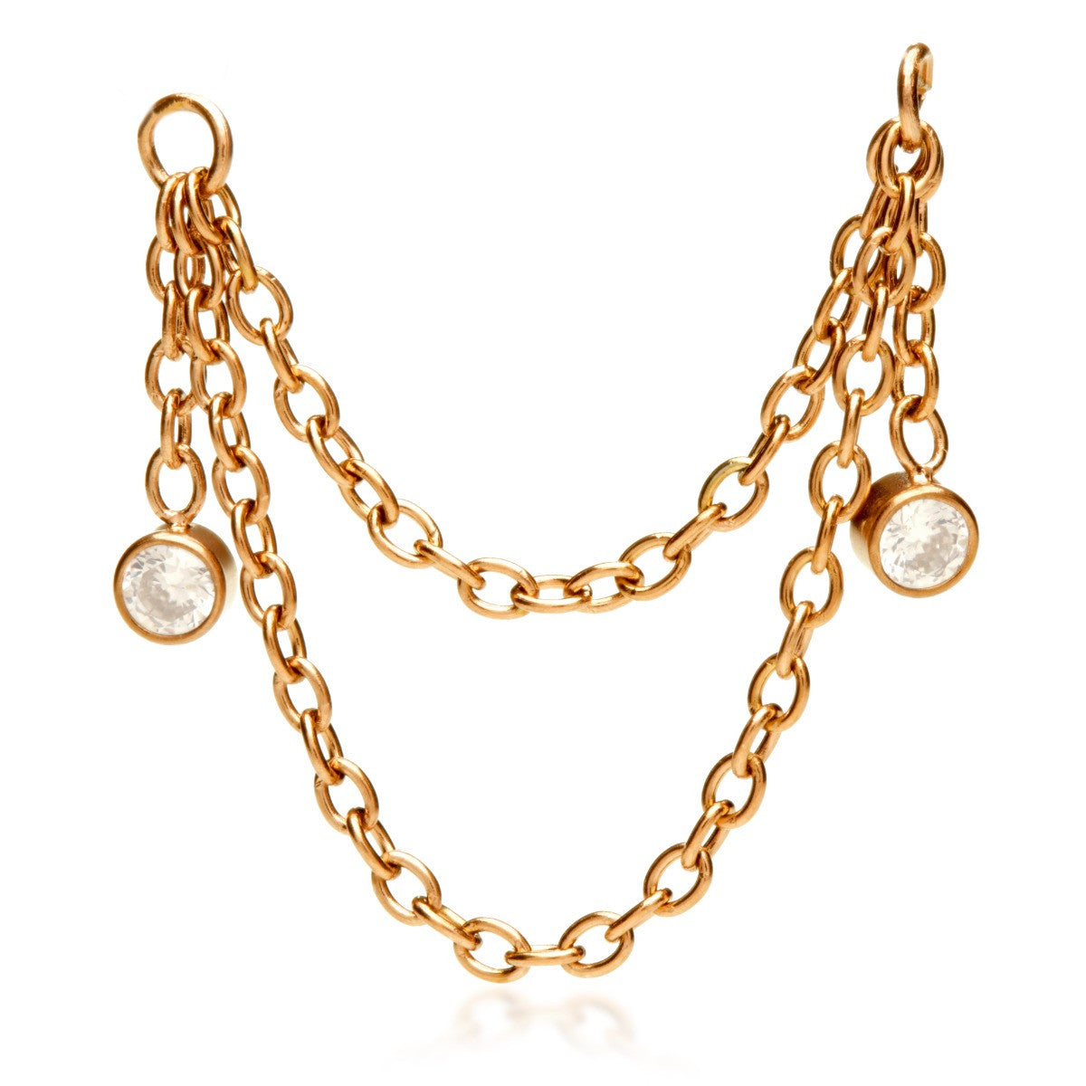 Rose Gold Steel Hanging Double Chain with Hanging Gems Chain Lengths: 16+24mm, 20+28mm, 25+34mm, 32+48mm, 38+52 Side Chain Length: 10mm Gem Size: 3mm Gem Colour: CR CZ Gem Stones 316L Surgical Steel