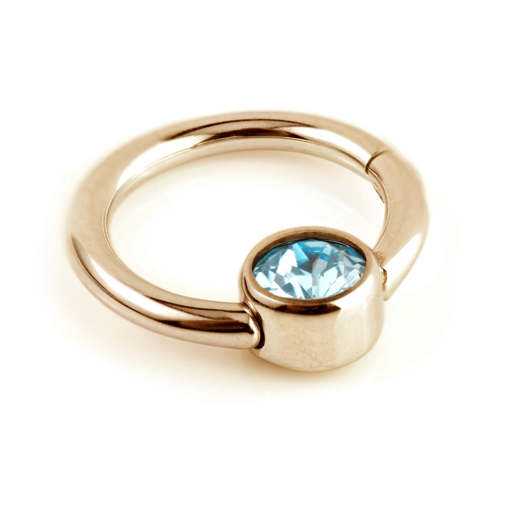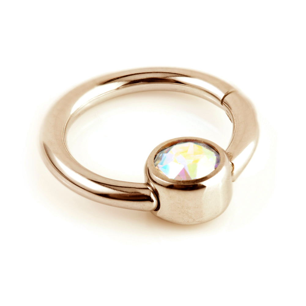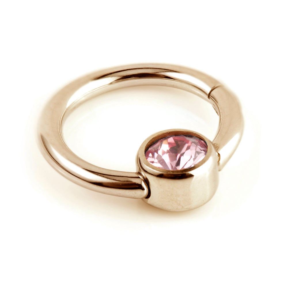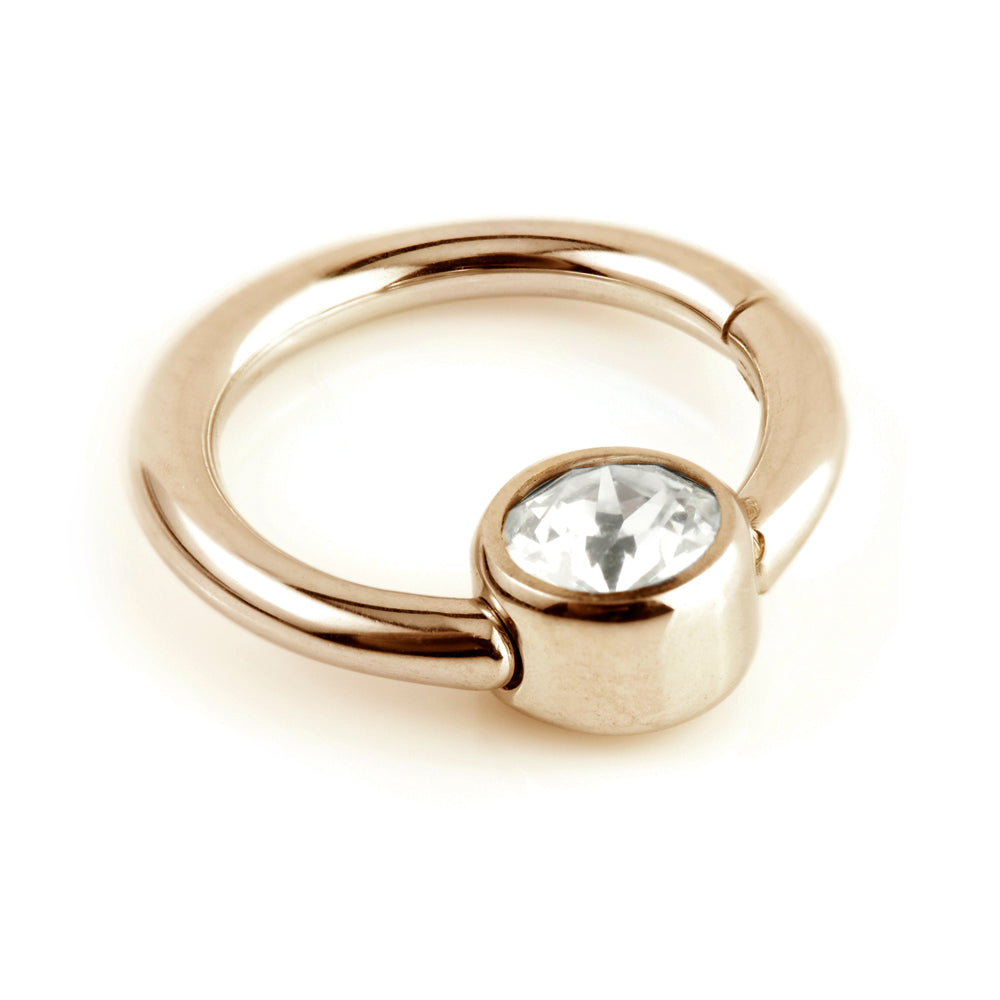 Rose Gold on 316L Surgical Steel Hinge Segment Ring Gauge: 1.2mm Size: 8mm Gem Size: 4mm Gem Colour: Crystal, Lt Rose, AB, Aqua