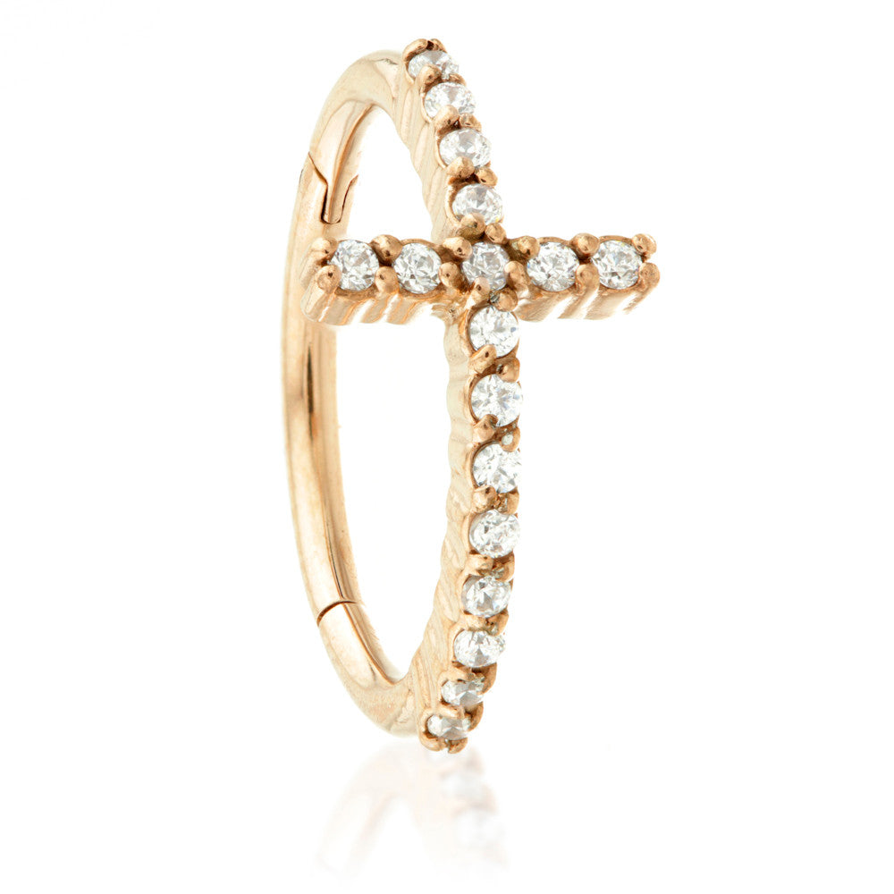 Rose Gold Steel Hinged Jewelled Pave Cross Bar Conch Ring