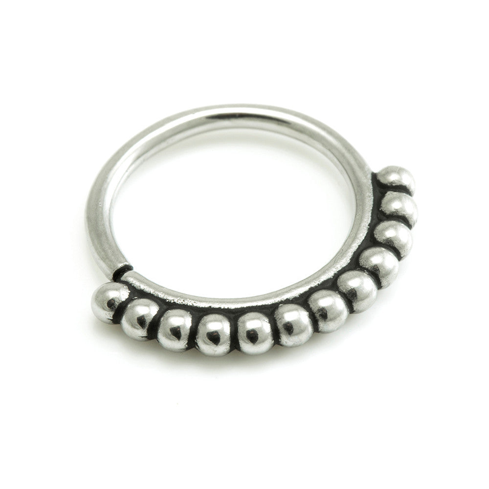 Open by hand - Seamless Septum / Ear Rings in Bohemian designs Made from cast steel - annealed for easy opening Sizes: 0.8mm x 7mm/8mm, 1mm x 7mm/8mm, 1.2mm x 8mm/10mm Can also be worn through tunnels