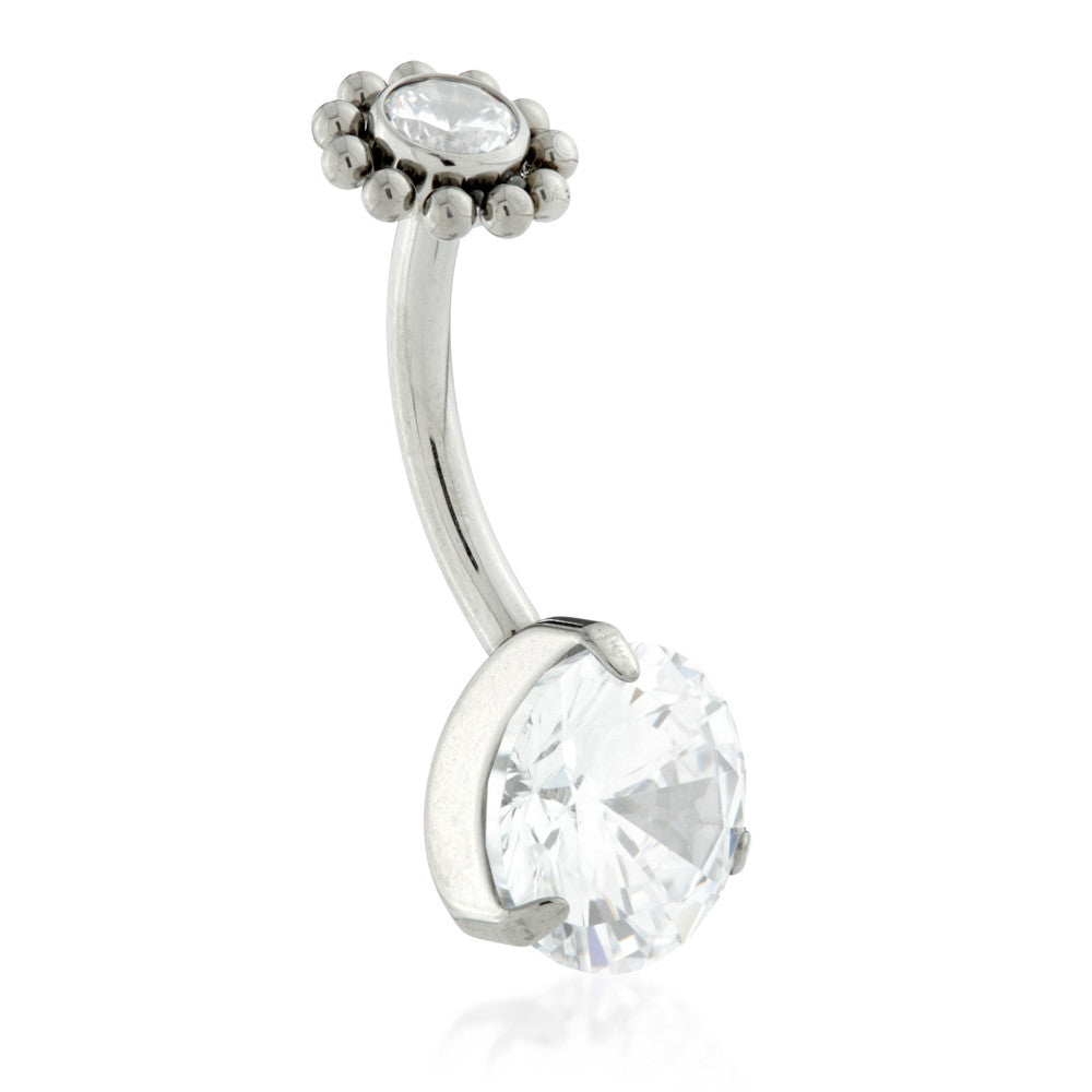 Threadless Ti Double Round Gem Belly Bar with Gem and Ball Flower Top Gauge: 1.6mm Size: 10/12mm Gem Colour: Crystal Medical Grade Titanium 6Al-4VEli ASTM:F-136