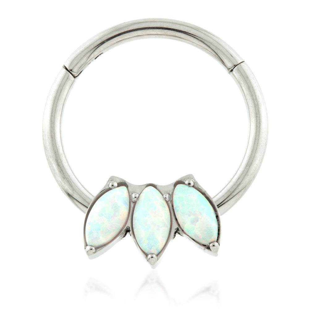 Titanium Forward Facing Marquise Triple Opal Hinged Ring Gauge: 1.2mm Sizes: 8/10mm Opal Colours: WT Synthetic Opal Stones Medical Grade Titanium 6Al-4VEli ASTM:F-13