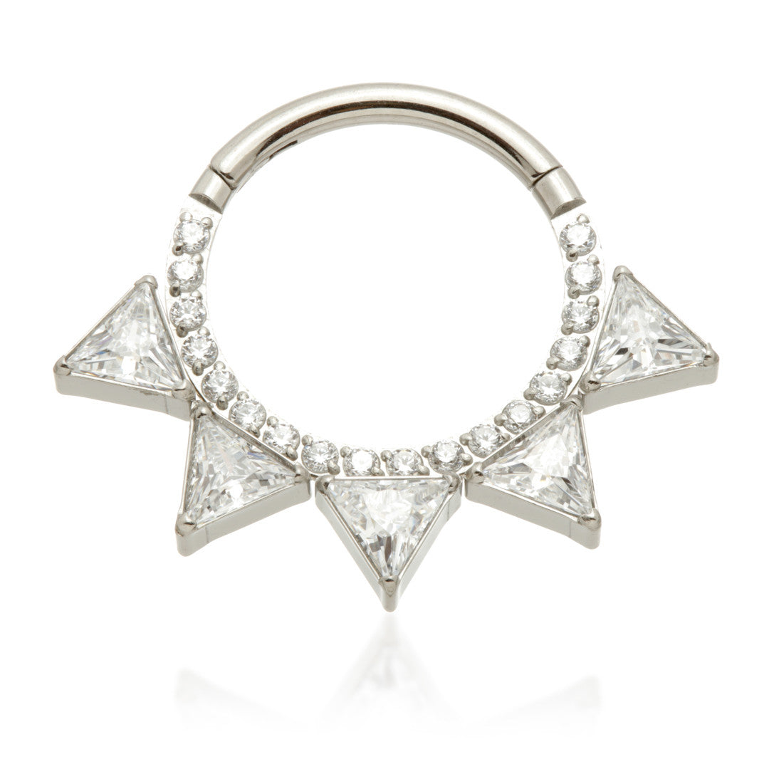 Titanium Pave Jewelled Trillian Cut Hinged Ring Gauge: 1.2mm Sizes: 8/10mm Gem Colours: CR CZ Gem Stones Medical Grade Titanium 6Al-4VEli ASTM:F-136
