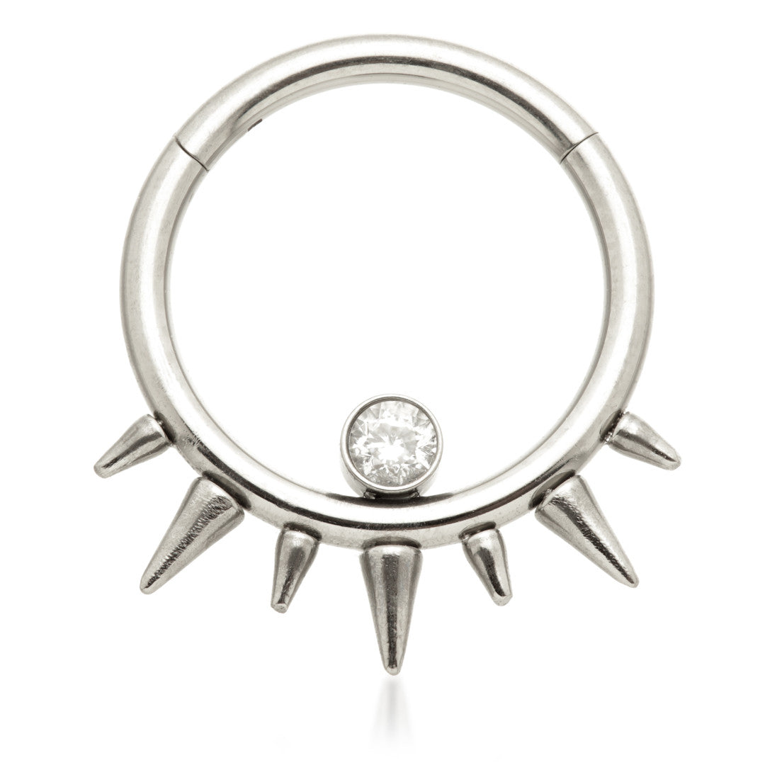 Titanium Front Facing Spiked with Bezel Hinged Ring Gauge: 1.2mm Sizes: 8/10mm Gem Size: 2.5mm Gem Colour: CR CZ Gem Stones Medical Grade Titanium 6Al-4VEli ASTM:F-136