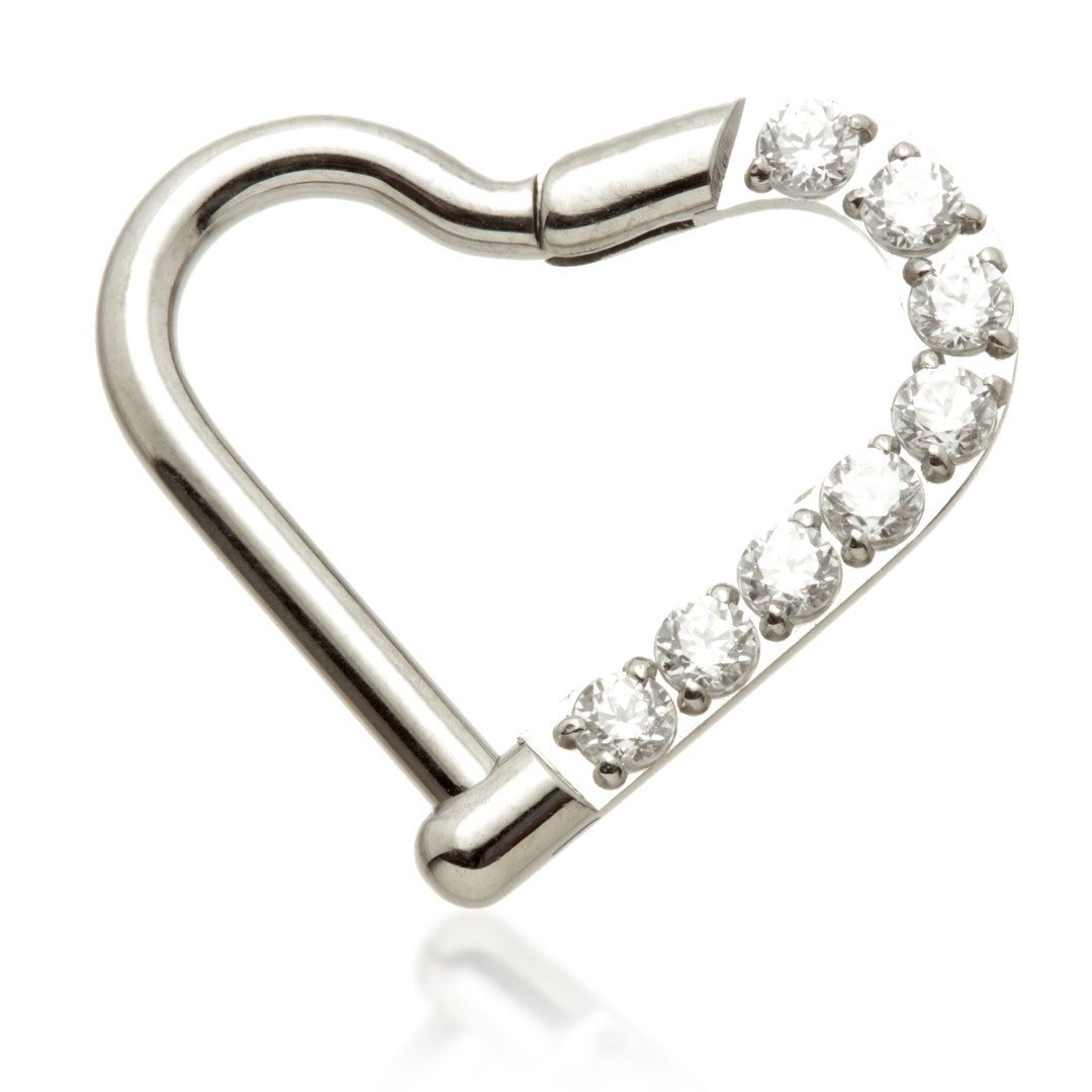 Titanium Half Pave Open Heart Shaped Ring Gauge: 1.2mm Sizes: 8mm Side: Right, Left Gem Size: 1.20mm Gem Colour: CR CZ Gem Stones Medical Grade Titanium 6Al-4VEli ASTM:F-136