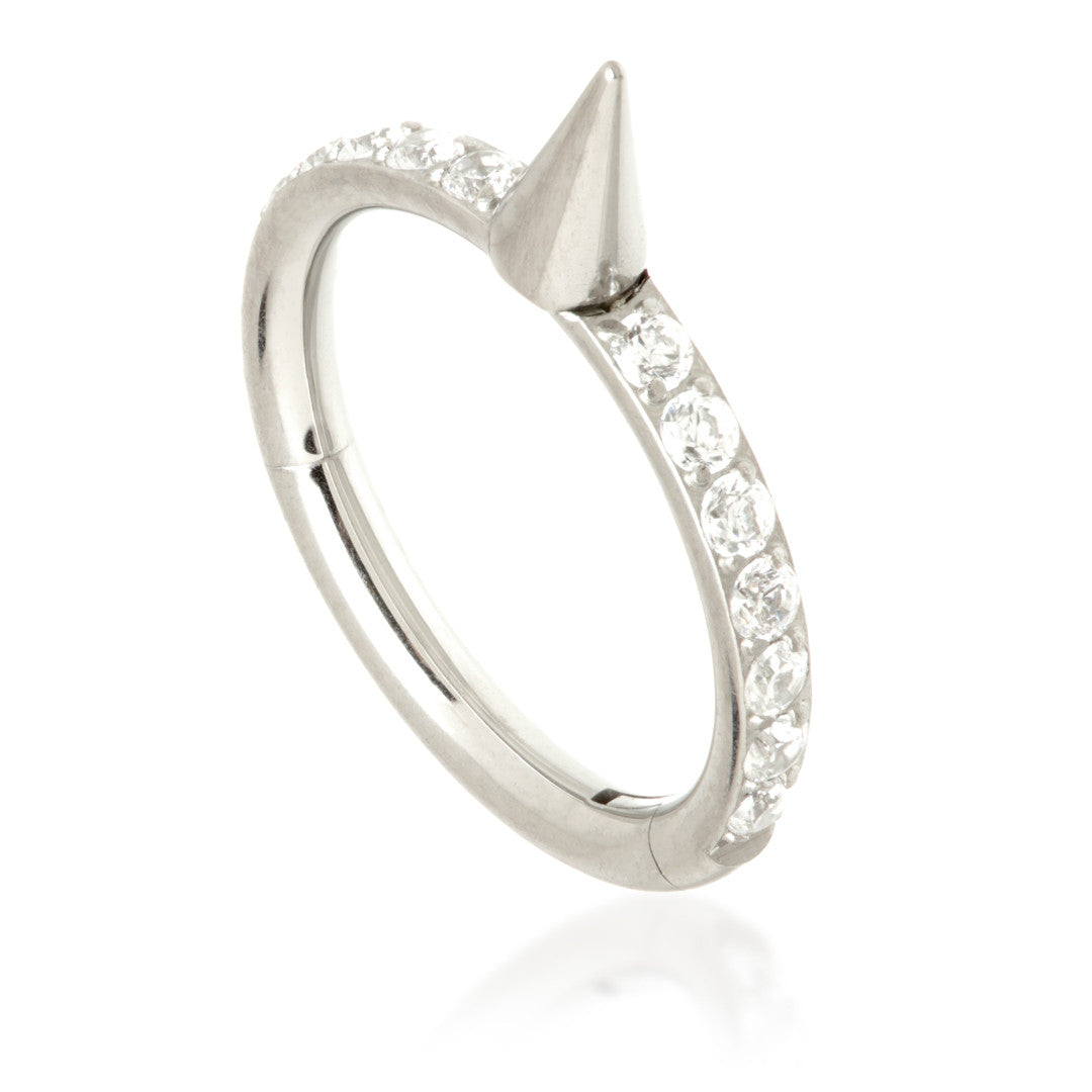 <p>Ti Couture Pave Single Spike Hinged Ring</p> <p>Gauge: 1.2mm Size: 8mm CZ Gem Stones</p> <p>Medical Grade Titanium 6Al-4VEli ASTM:F-136</p>