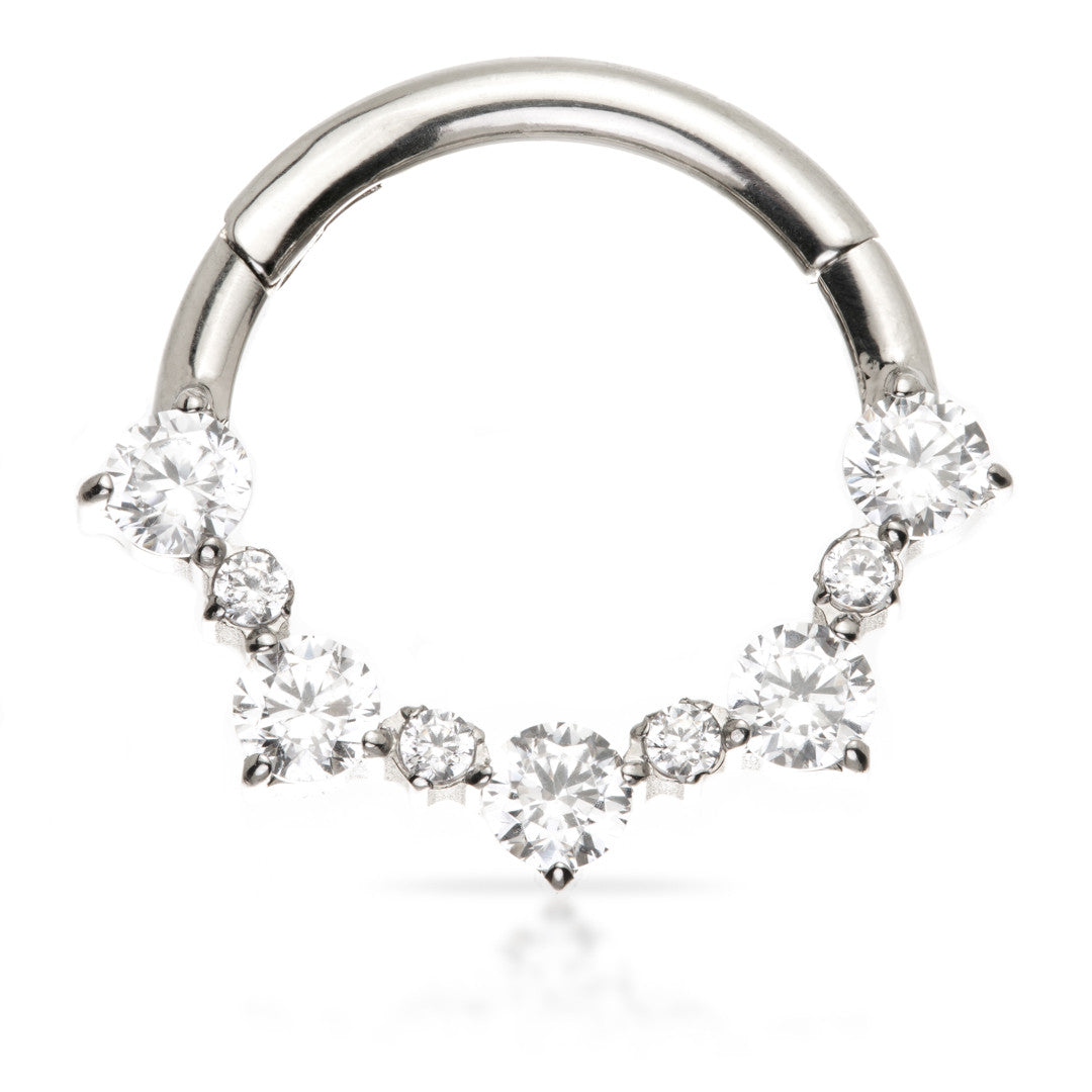 Ti Couture Prong Set Gem Forward Facing Hinged Ring </br> </p> Gauge: 1.2mm </br> Diameter: 8mm </br> Gem Colour: </br> </p> Medical Grade Titanium 6Al-4VEli ASTM:F-136 </p>