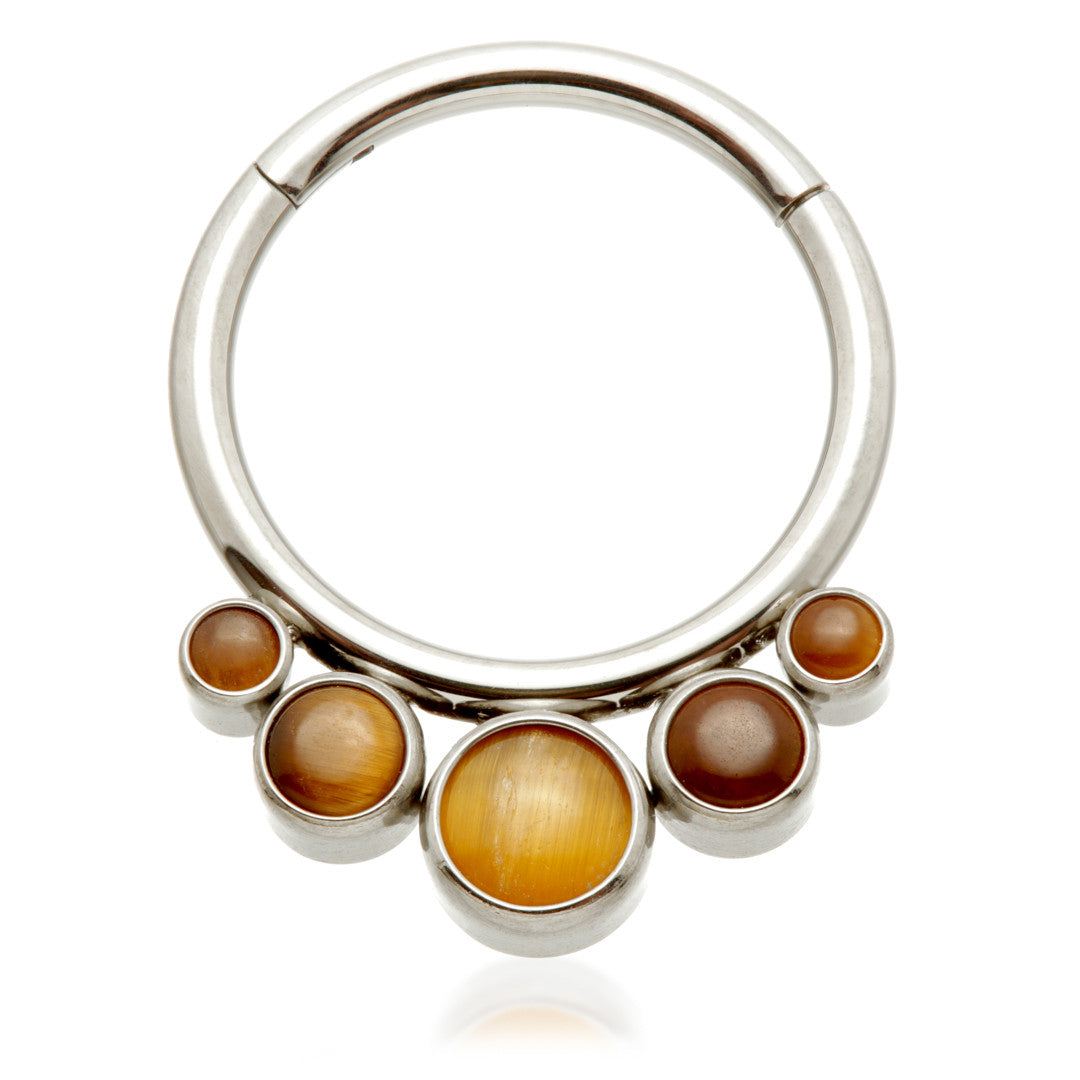 Titanium Front Facing Bezel Set with Tiger Eye Stone Hinged Ring Gauge: 1.2mm Sizes: 8/10mm Stone: Tiger Eye Medical Grade Titanium 6Al-4VEli ASTM:F-136