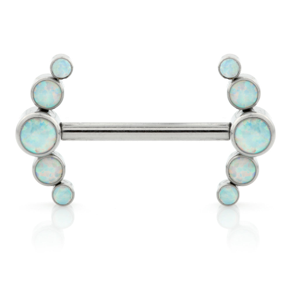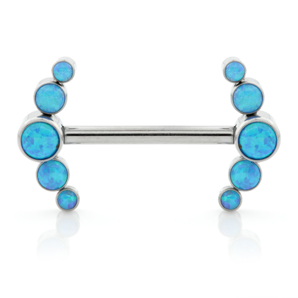 Titanium Internal Forward Facing Double Opal Crescent Barbell Please note, one end is fixed on to the bar and the other is removable. Blue or White Opal Gauge: 1.6mm Size: 16mm Opal Size: 2/3/4/3/2mm (each crescent) Medical Grade Titanium 6Al-4VEli ASTM:F-136