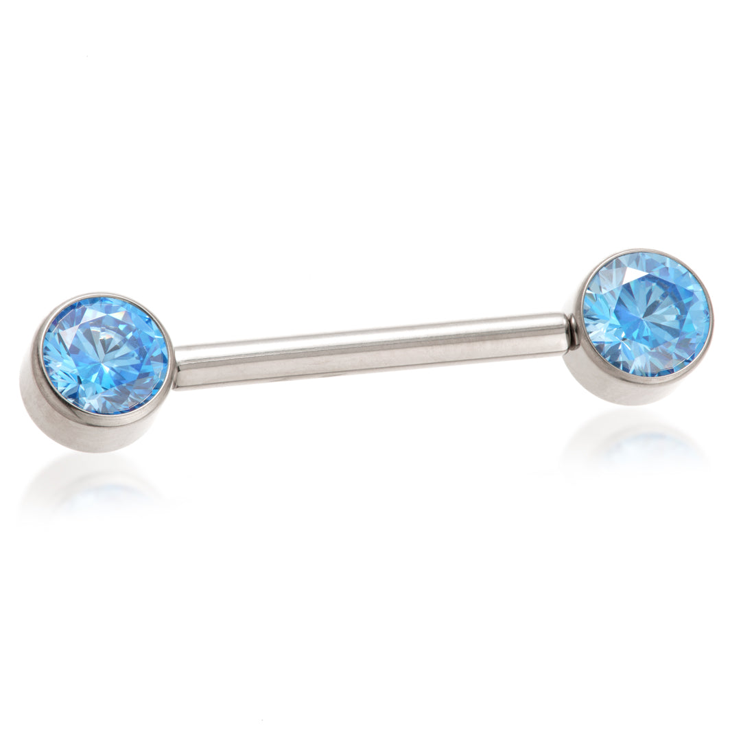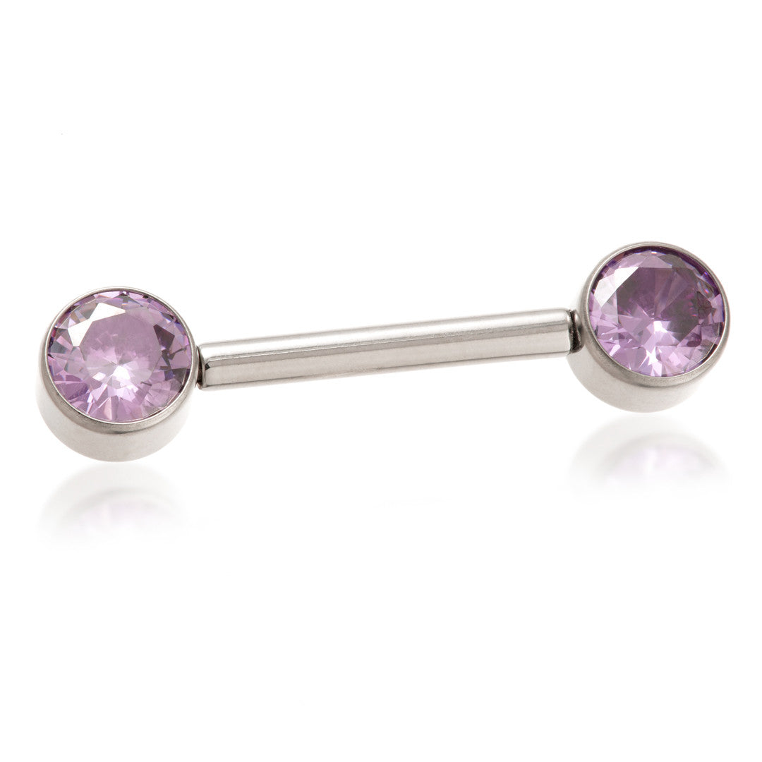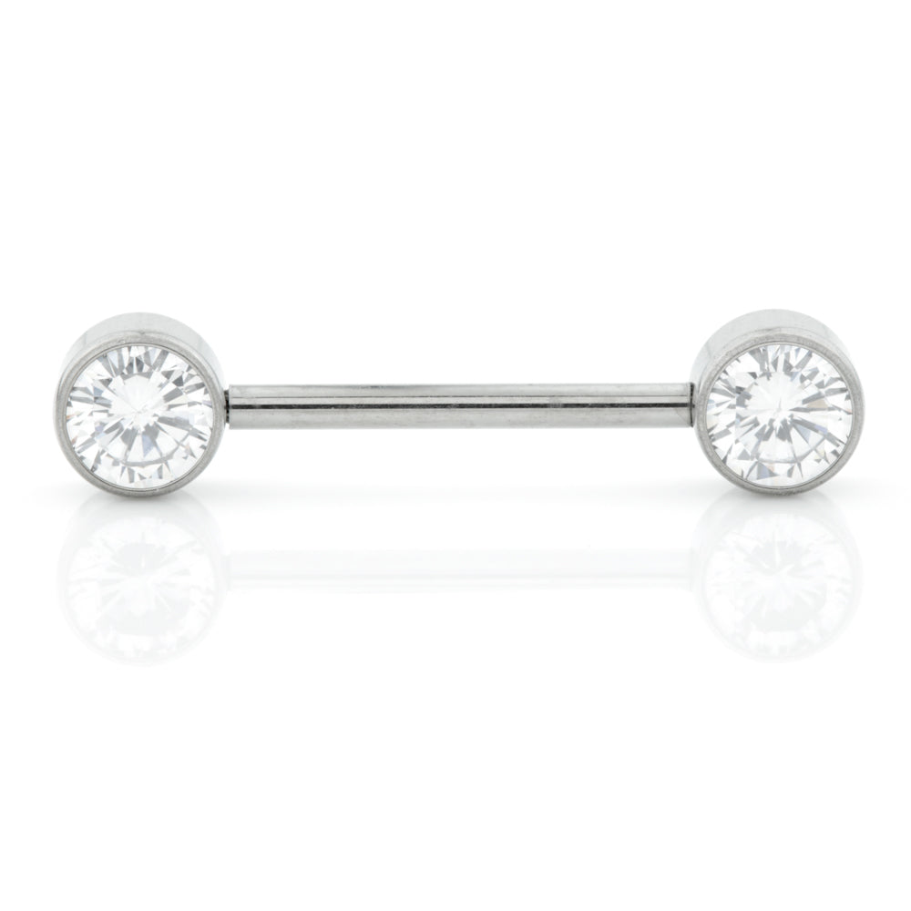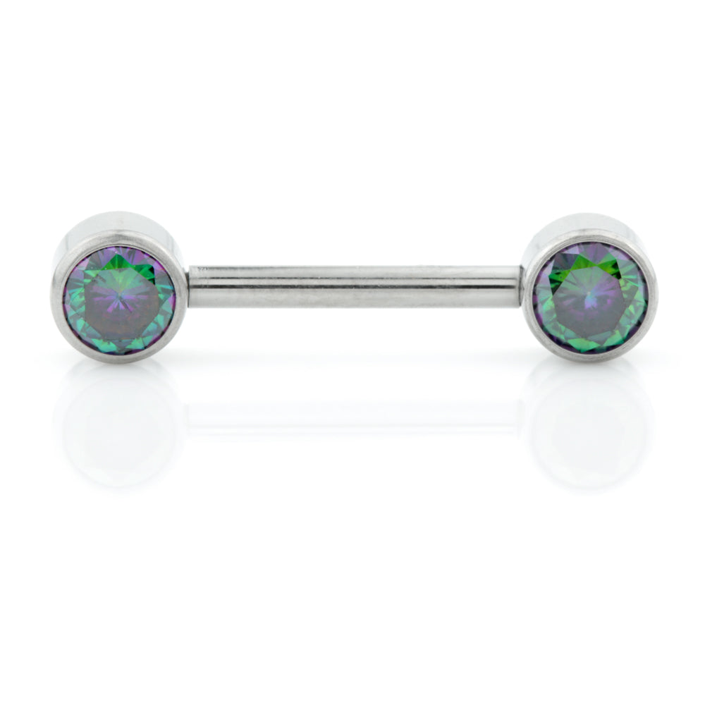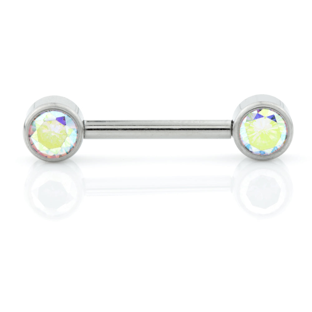 Titanium Internal Forward Facing Double Jewelled Disk Barbell. Gem Colours: Crystal, AB Crystal, Rose, Vitrail Medium. Gauge: 1.6mm Disk size: 5mm Bar Size: 12mm or 16mm Medical Grade Titanium 6Al-4VEli ASTM:F-136