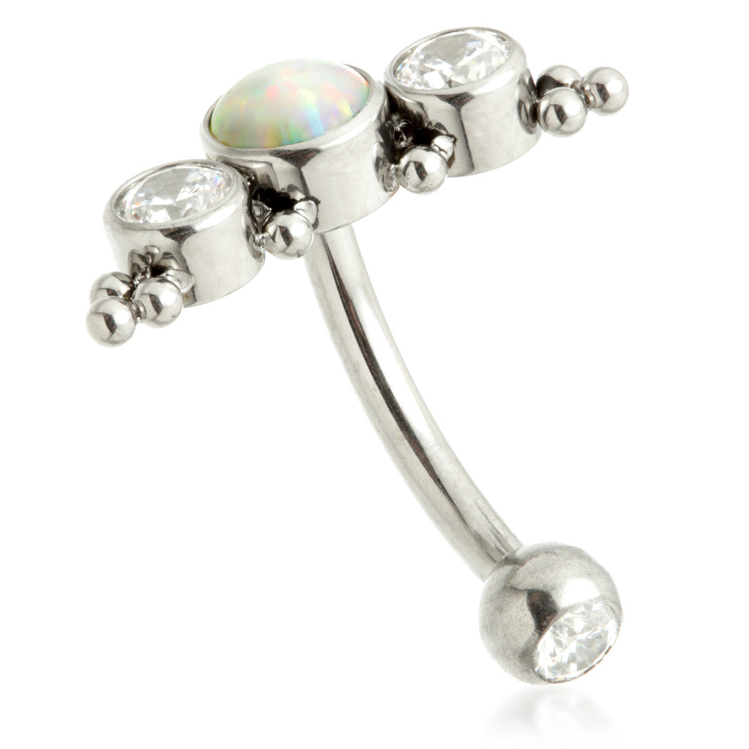 Titanium Internal Triple Bezel Opal and Gem Cluster Rook Bar Gauge: 1.2mm Size: 8mm Opal Colour: White Gem Colour: CR CZ Gem Stones Medical Grade Titanium 6Al-4VEli ASTM:F-136