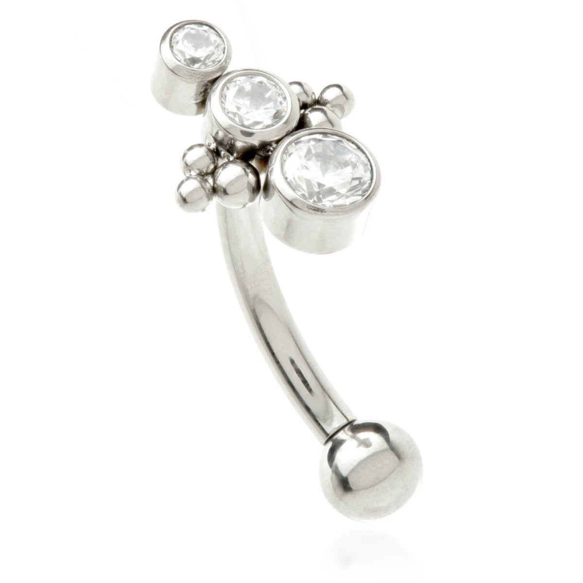 Titanium Internal Triple Bezel with Side Beads Rook/Eyebrow Bar Gauge: 1.2mm Size: 8mm Ball Size: 3mm Gem Colour: CR CZ Gem Stones Medical Grade Titanium 6Al-4VEli ASTM:F-136