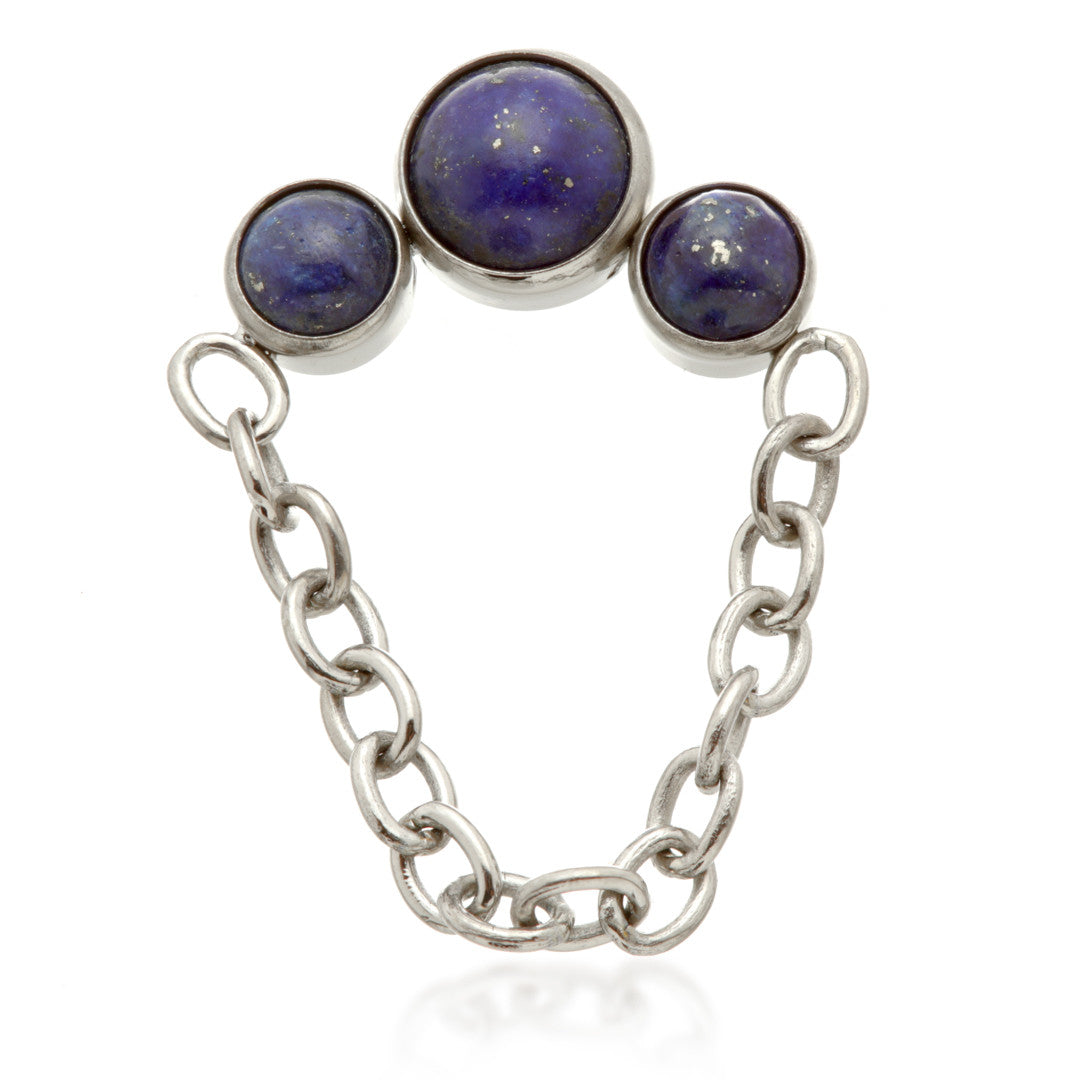 Titanium Internal Triple Lapis Stone Bezel with Hanging Chain Attachment Gauge: 1.2mm (0.9mm thread) Attachment Size: 5mm x 10mm Stone Sizes: 3+4+3mm Chain Length: 20mm Stone: Lapis Medical Grade Titanium 6Al-4VEli ASTM:F-136