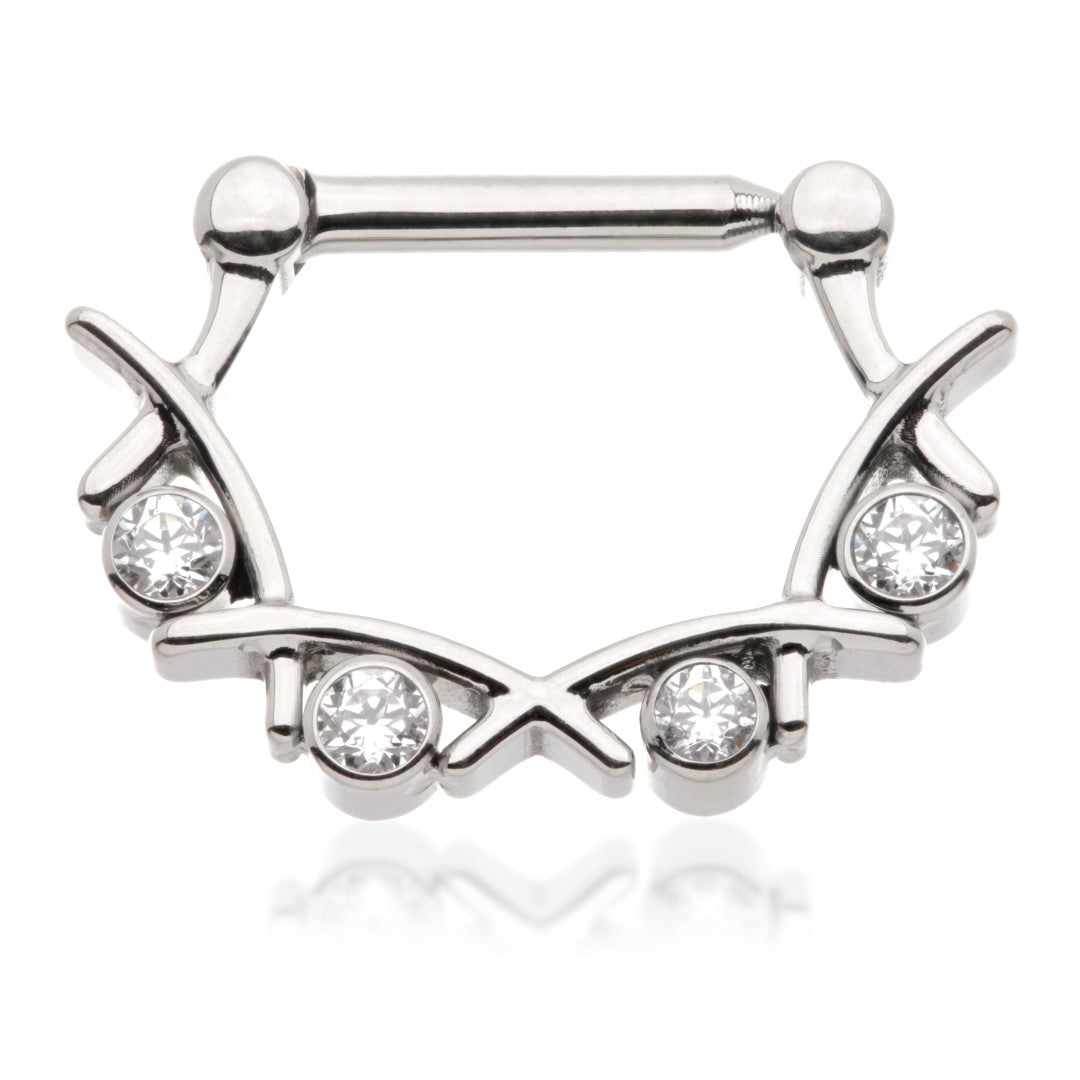 Ti Jewelled Crisscross Hinged Septum Ring Gauge: 1.2mm Size: 8mm Gem Colour: Crystal Medical Grade Titanium 6Al-4VEli ASTM:F-136