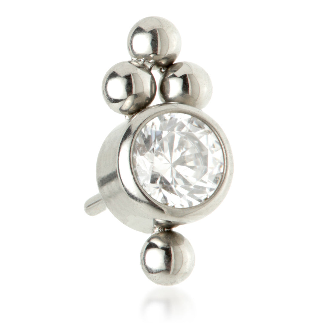 Titanium Threadless Caeli Gem Attachment Gauge: 1.0/1.2/1.6mm (0.5mm threadless) Attachment Size: 3mm x 6.5mm Gem Size: 3mm Gem Colour: CR CZ Gem Stones Medical Grade Titanium 6Al-4VEli ASTM:F-136