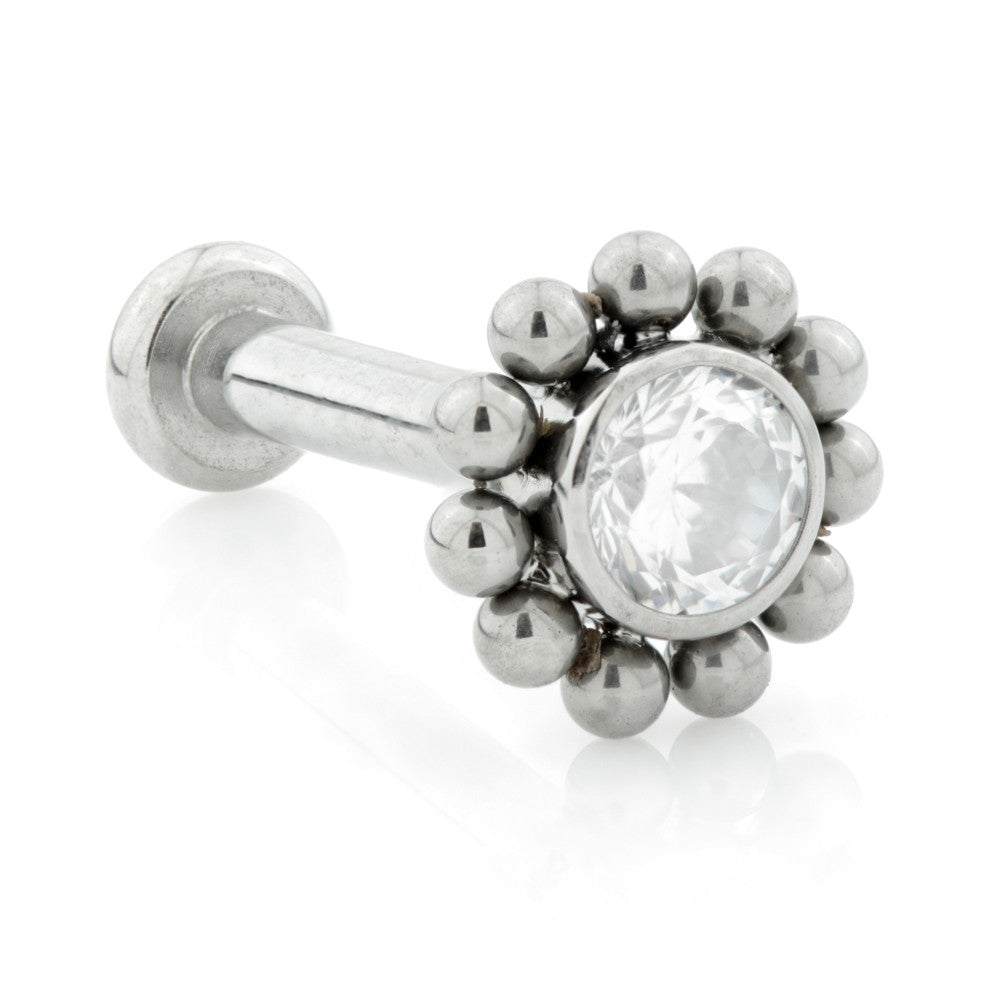 Titanium Threadless Labret with Gem and Bead Surround Attachment Gauge: 1.2mm Size: 8mm Gem Colour: CR Medical Grade Titanium 6Al-4VEli ASTM:F-136