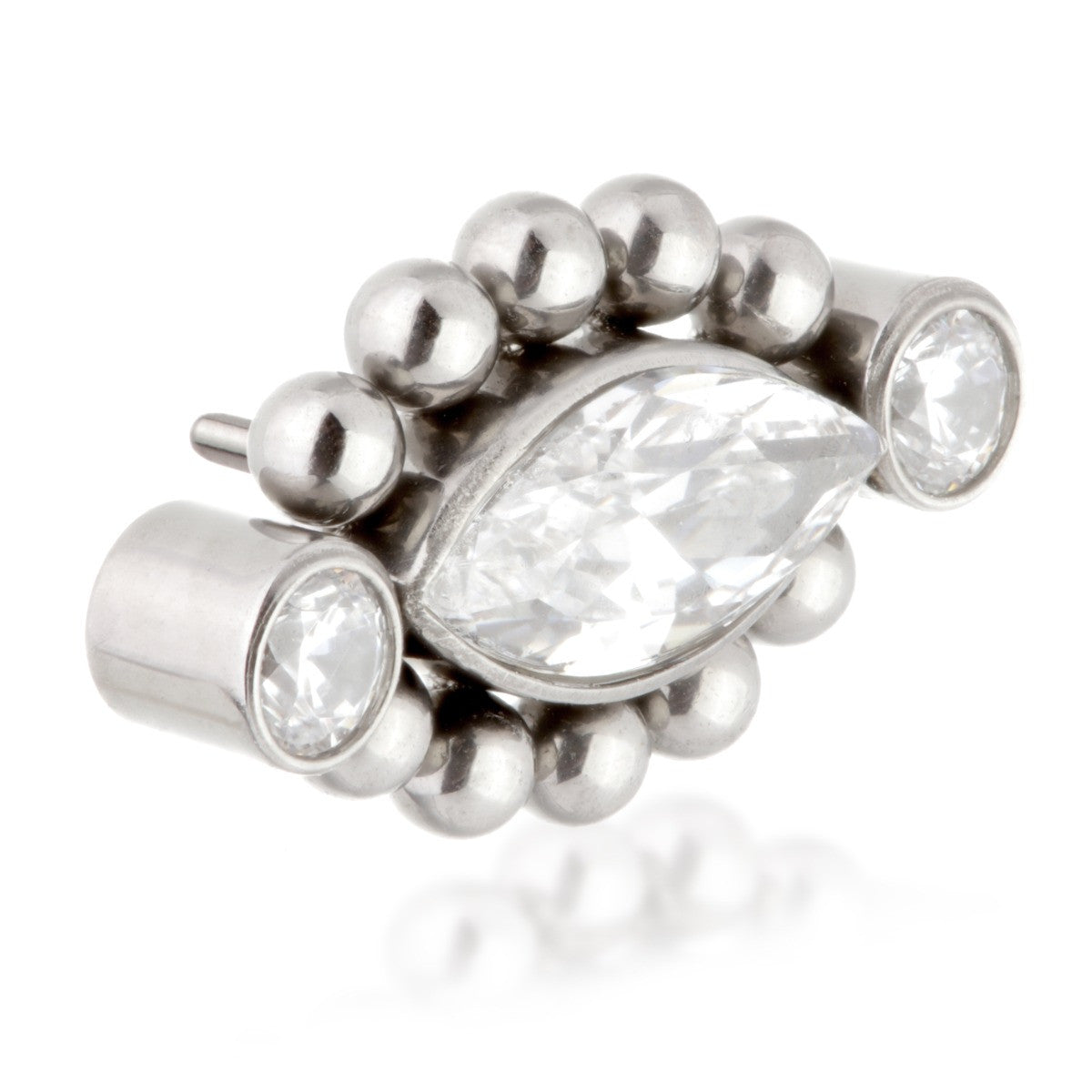 Titanium Threadless Millegrained Marquise with Side Gems Attachment Gauge: 1.0/1.2/1.6mm (0.5mm threadless) Size: 5.5mm x 9.5mm Gem Colour: CR CZ Gem Stones Medical Grade Titanium 6Al-4VEli ASTM:F-136