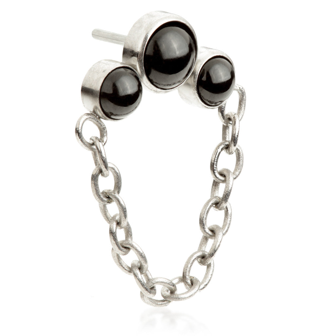 Titanium Threadless Triple Black Onyx Stone Bezel with Hanging Chain Attachment Gauge: 1.2mm Attachment Size: 5mm x 10mm Stone Sizes: 3+4+3mm Chain Length: 20mm Stone: Black Onyx Medical Grade Titanium 6Al-4VEli ASTM:F-136