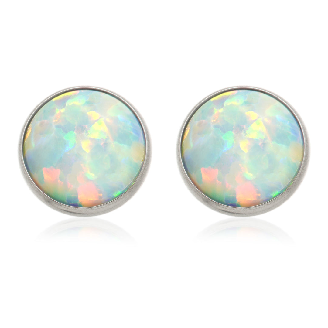 Titanium Opal Disk Stud Earrings (butterfly back)(Pair) Gauge: 0.8mm Earring Post: 11mm Opal Colour: White Gem Size: 2.5mm / 3mm / 4mm Medical Grade Titanium 6Al-4VEli ASTM:F-136