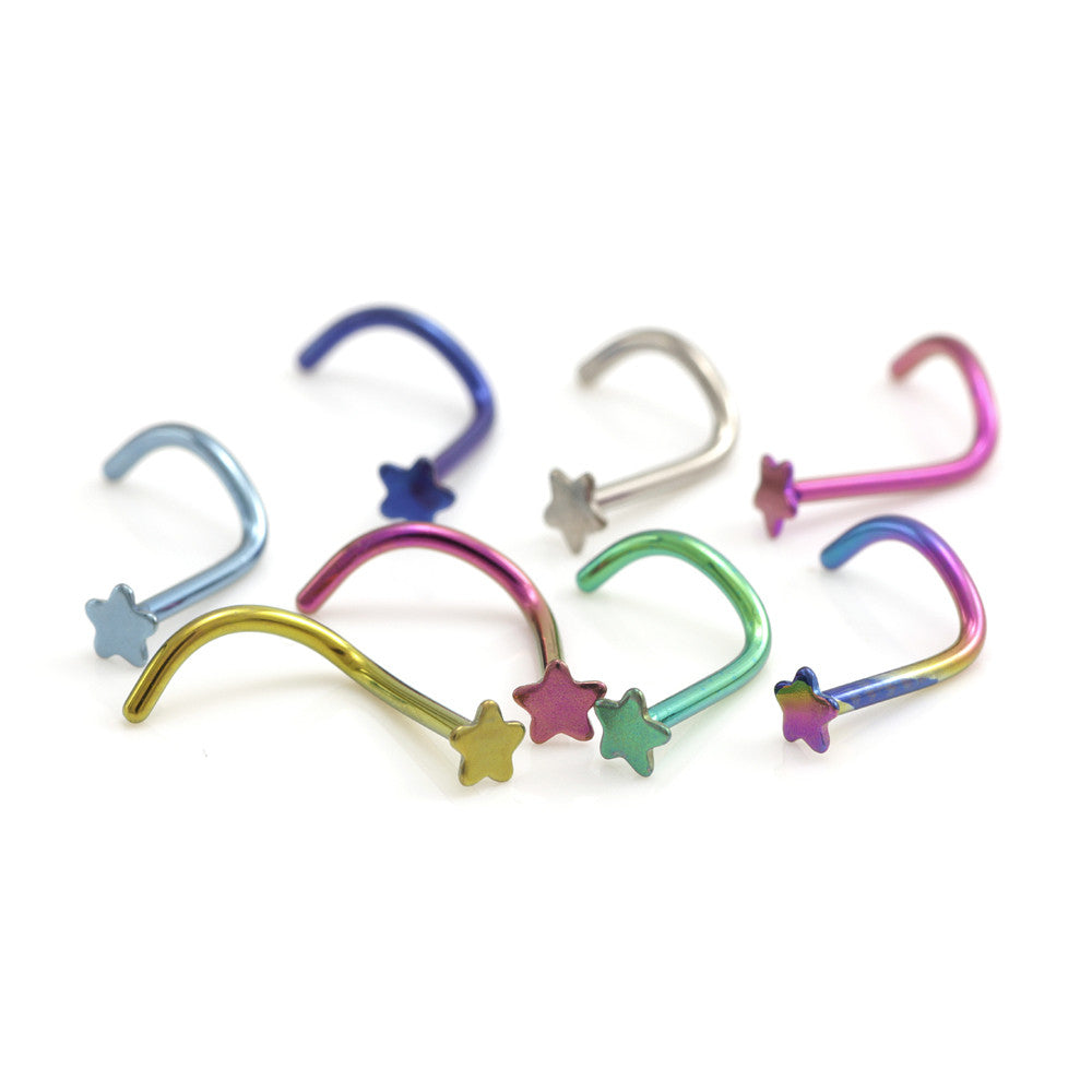 Titanium Nose Studs with Cut Out Star Tops Gauge: 0.8mm Colours: HP, Blue, Lt Blue, Pink, Purple, Yellow, Green and Rainbow Medical Grade Titanium 6Al-4VEli ASTM:F-136