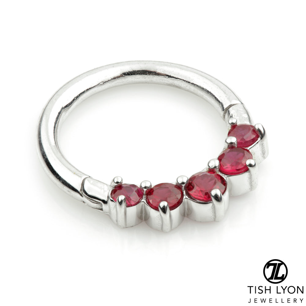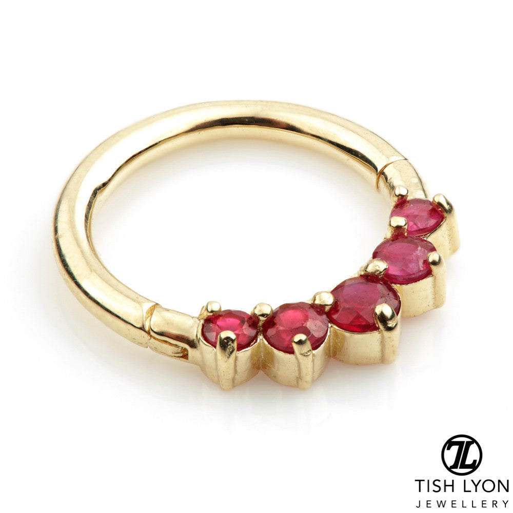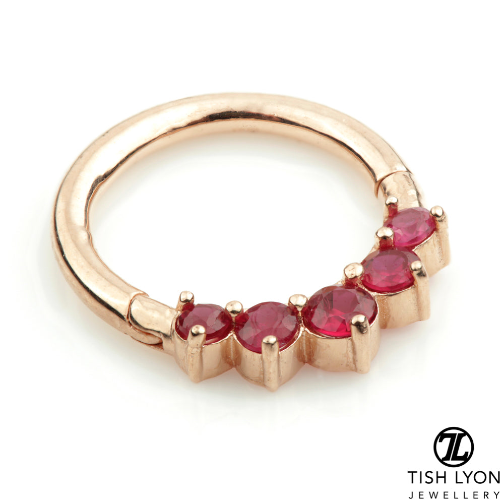 TISH LYON® - Front Facing Gem Hinge Segment Ring 14ct Yellow, White or Rose Gold Rubies (1.5*1.75*2*1.75*1.5mm) / Grade: A (Natural Stone) Size: 1.2mm x 8mm For Septum, Cartilage, Tragus, etc Suitable for initial piercing (autoclave on coolest heat) Laser Mark - 14K TL