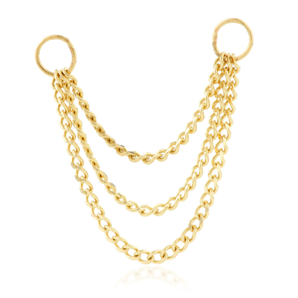 TISH LYON® Gold Hanging Triple Chain for Cartilage Bars with Ball or Flat Back Colour: Yellow or White Chain Lengths: 16+22+28mm / 25+34+44mm / 38+52+67mm / 50+64+79mm O-ring Inner Diameter: 2mm