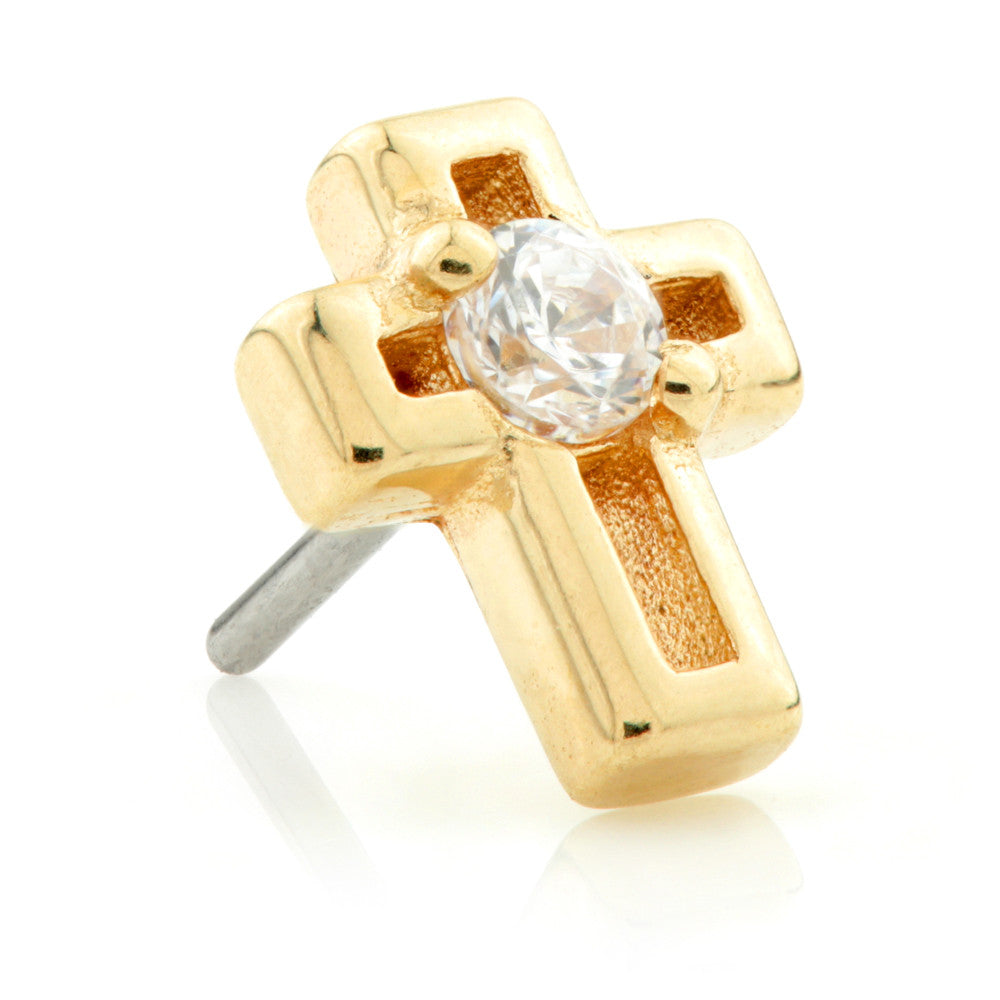 TISH LYON - 14ct Gold Threadless Open Gem Cross Attachment Gauge: 1.2mm Size: 4mm x 5.5mm Gem Size: 1.75mm Gold Colour: Yellow Gem Colour: CR CZ Gem Stones 14ct Solid Gold Top on 316L Surgical Steel Pin Suitable for initial piercing