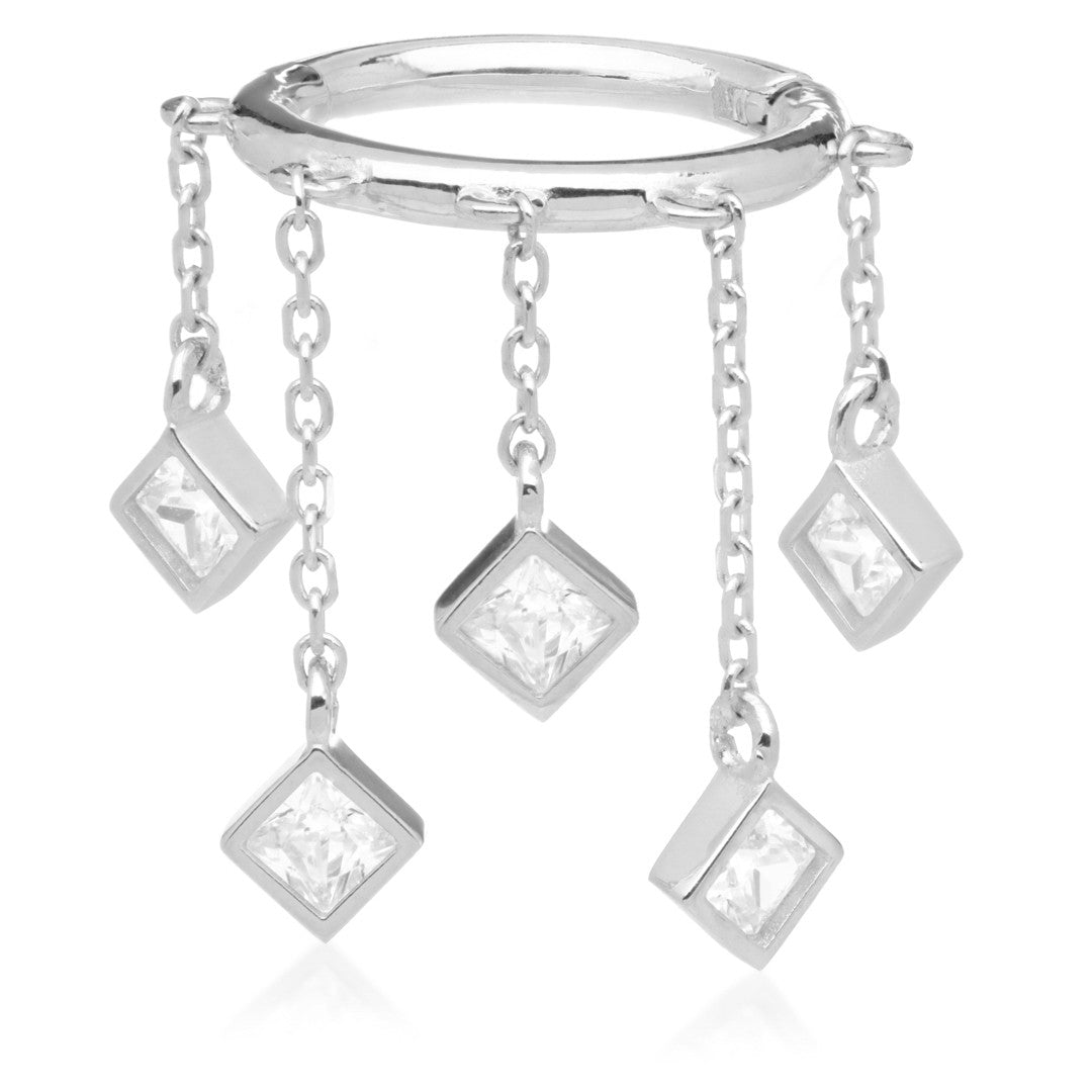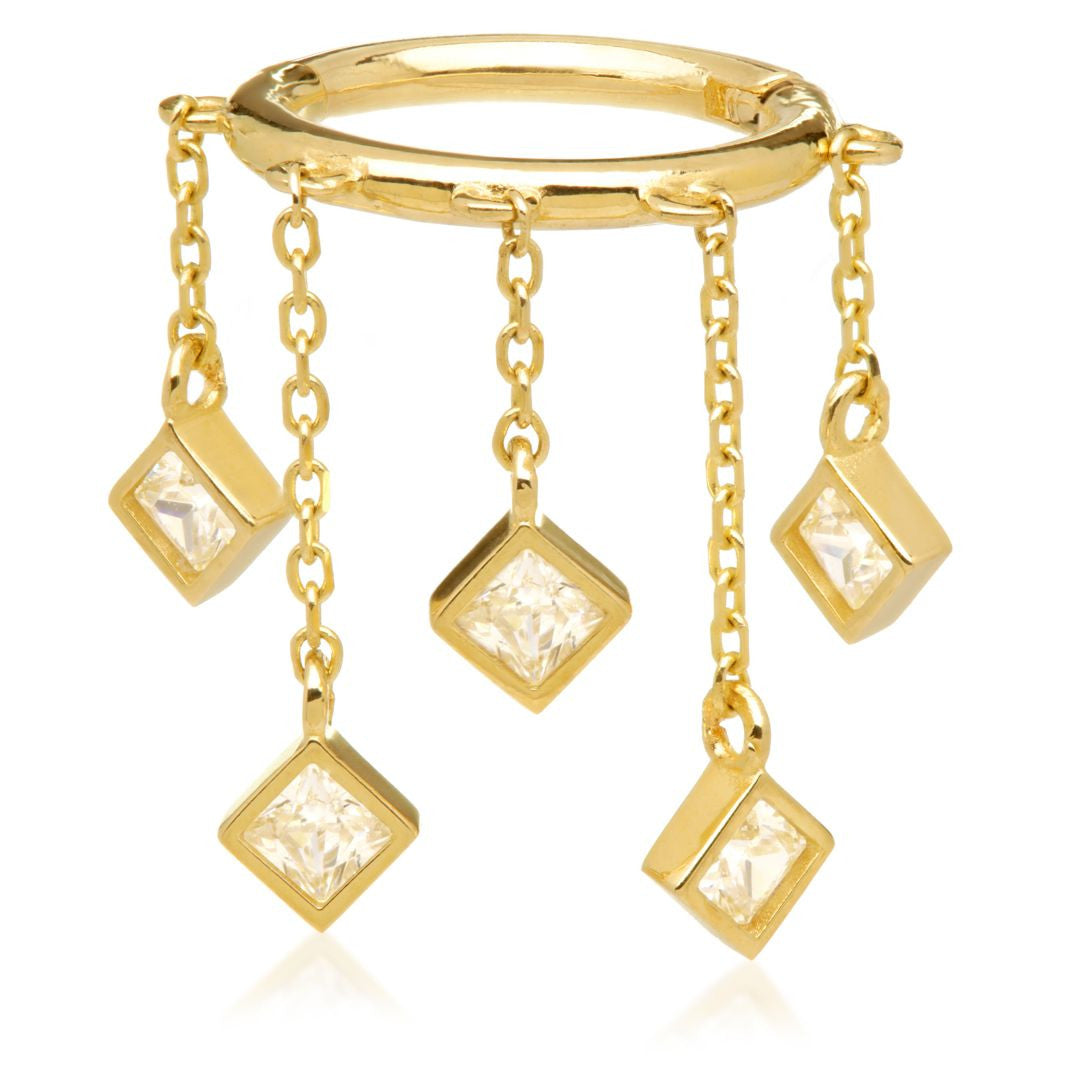 TISH LYON® - Gold Hinged Ring with Hanging Square Gems Gauge: 1.2mm Size: 6mm / 8mm Gem Size: 6mm = 2*2mm x 3 & 8mm = 2*2mm x 5 Carat: 9ct or 14ct Gold Colour: Yellow or White Gem Colour: Crystal
