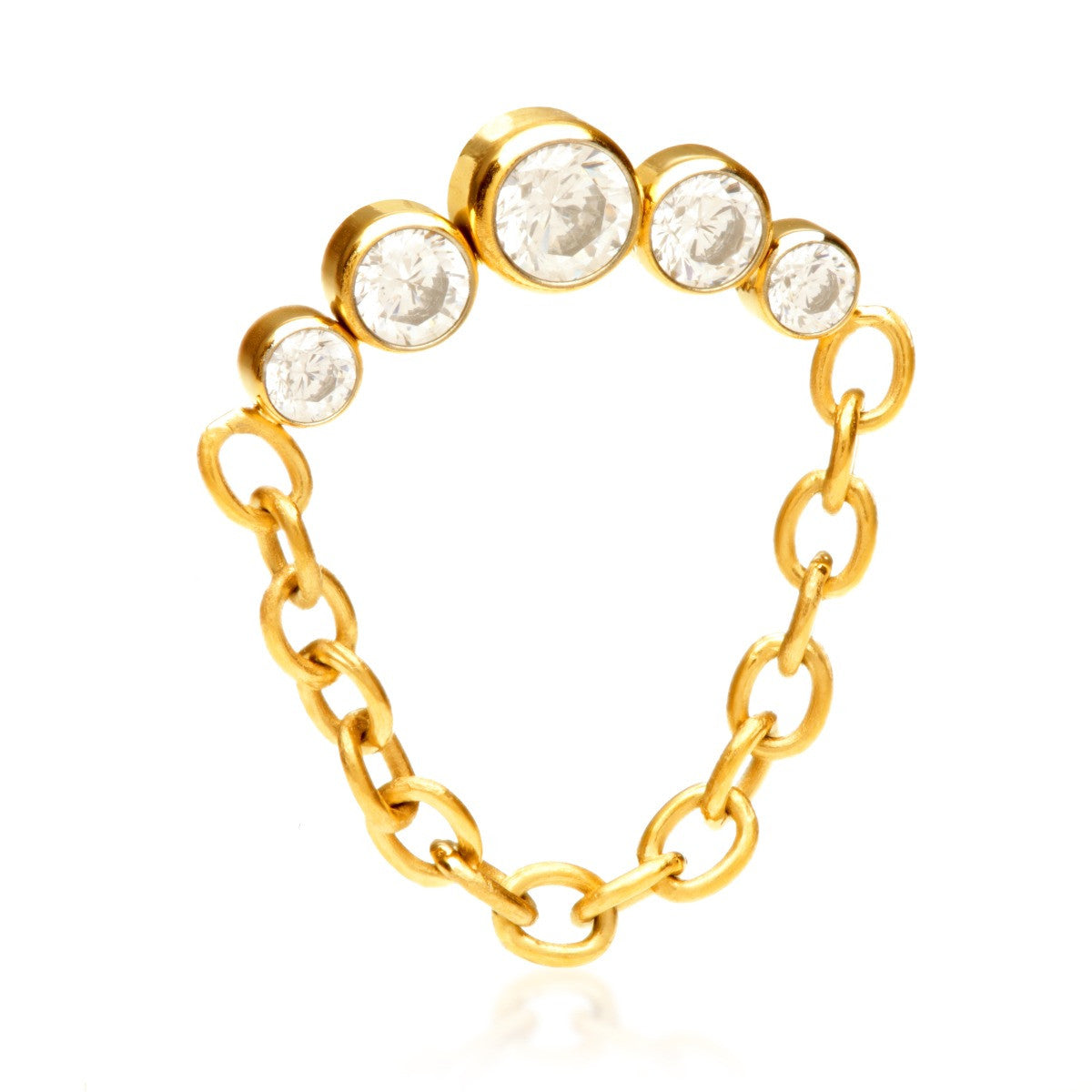 Zircon Gold Titanium Internal Bezel Gem Crescent with Hanging Chain Attachment Gauge: 1.2mm (0.9mm thread) Attachment Size: 4mm x 12mm Gem Sizes: 2+2.5+3+2.5+2mm Chain Length: 20mm Gem Colour: CR CZ Gem Stones Medical Grade Titanium 6Al-4VEli ASTM:F-136