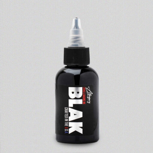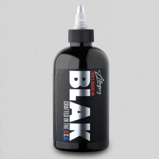 Best for lining and shading. Allegory BLAK is a smooth, consistent blend of liquid dispersed pigment. This rich black ink comes in a 2oz or 8oz PET clear Squat Boston round bottle. Bottles are heat sealed with tamper resistant twist-dispensing tops. Allegory BLAK is 100% Vegan Friendly.