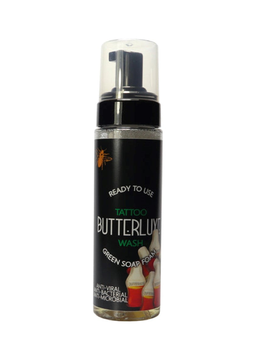 Butterluxe Ready To Use Green Soap Foam Packed with anti-bacterial and anti-inflammatory properties. Effectively removes excess ink whilst soothing the affected area. Contains Chlorhexidine, one of the worlds most effective disinfectants. Packed with Anti-Microbial Properties! 100% Natural Oil Based! Complies with BS EN 1276, BS EN 13697, BS EN 16615 (Keeping your local authority happy!) Shake well, use directly from bottle INGREDIENTS: Aqua, Lauramine Oxide, Glycerine, Chlorhexidine Digluconate 2% And Essential Oils. Manufactured under license, for safety data sheet contact: info@butterluxe.co.uk