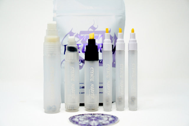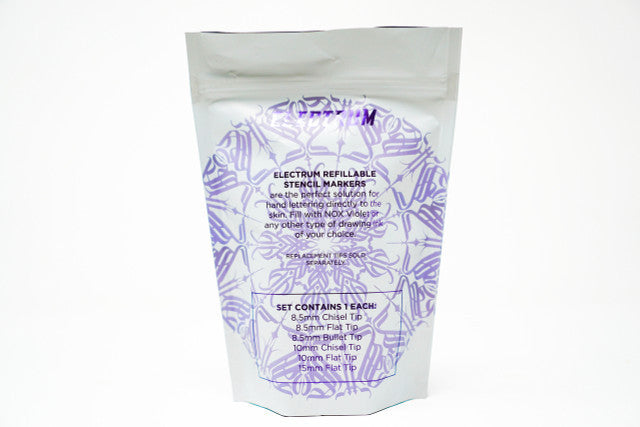 Change the game with these refillable stencil / calligraphy markers from Electrum Supply! Simply fill the markers with NOX Violet or any other ink of your choosing. Single use tips make these easy to use, safe for your clients, and affordable. Each pack of 6 markers contains 1 each of the following sizes: 1x 8.5mm Flat Tip 1x 8.5mm Chisel Tip 1x 8.5mm Bullet Tip 1x 10mm Flat Tip 1x 10mm Chisel Tip 1 x 15mm Flat Tip You will also receive 1 replacement tip for each marker.