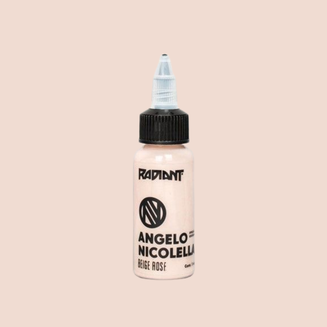 Beige Rose from the https://www.wholesalebodyjewellery.com/tattoo-supplies/product/tattoo-inks/radiant/angelo-nicolella.html Angelo Nicolella Set . Single bottle of https://www.wholesalebodyjewellery.com/tattoo-supplies/product/tattoo-inks/radiant.html Radiant Ink . Available in 1oz. Sterilised, easy to apply, pure, uncut homogenised pigment.