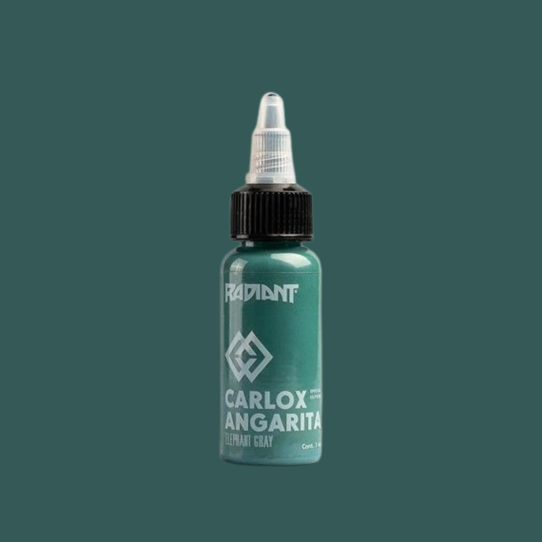 Elephant Grey from the https://www.wholesalebodyjewellery.com/tattoo-supplies/product/tattoo-inks/radiant/carlox.html Carlox Angarita Set . Single bottle of https://www.wholesalebodyjewellery.com/tattoo-supplies/product/tattoo-inks/radiant.html Radiant Ink . Available in 1oz. Sterilised, easy to apply, pure, uncut homogenised pigment.