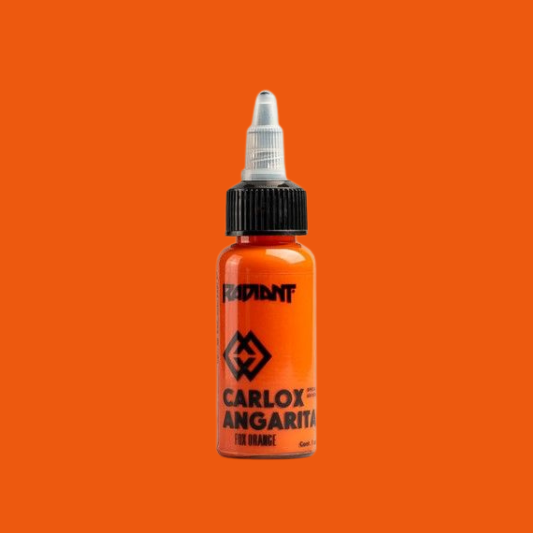 Fox Orange from the https://www.wholesalebodyjewellery.com/tattoo-supplies/product/tattoo-inks/radiant/carlox.html Carlox Angarita Set . Single bottle of https://www.wholesalebodyjewellery.com/tattoo-supplies/product/tattoo-inks/radiant.html Radiant Ink . Available in 1oz. Sterilised, easy to apply, pure, uncut homogenised pigment.