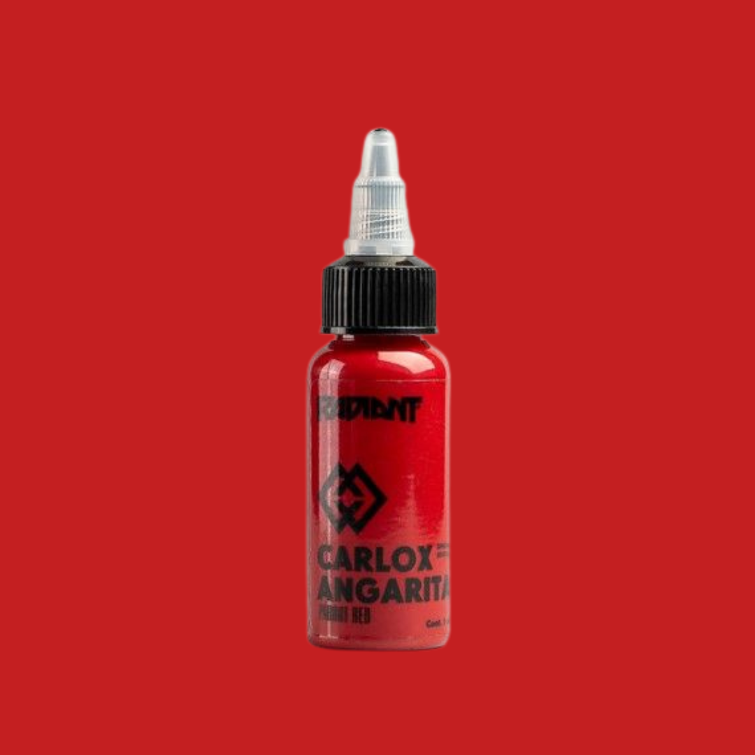 Parrot Red from the https://www.wholesalebodyjewellery.com/tattoo-supplies/product/tattoo-inks/radiant/carlox.html Carlox Angarita Set . Single bottle of https://www.wholesalebodyjewellery.com/tattoo-supplies/product/tattoo-inks/radiant.html Radiant Ink . Available in 1oz. Sterilised, easy to apply, pure, uncut homogenised pigment.