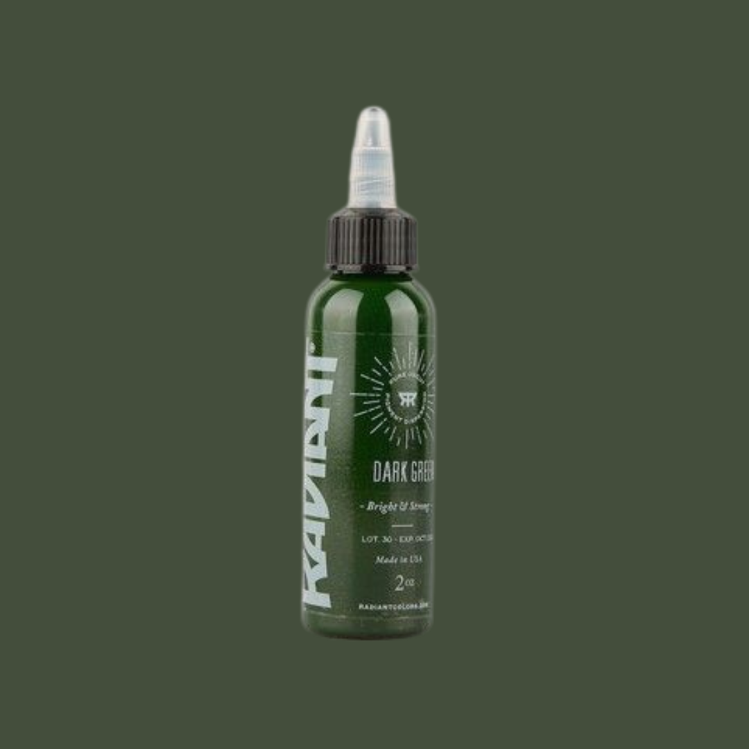 Dangerously dark and perfectly green. Single bottle of https://www.wholesalebodyjewellery.com/tattoo-supplies/product/tattoo-inks/radiant.html Radiant Ink . Available in 1oz. Sterilised, easy to apply, pure, uncut homogenised pigment.