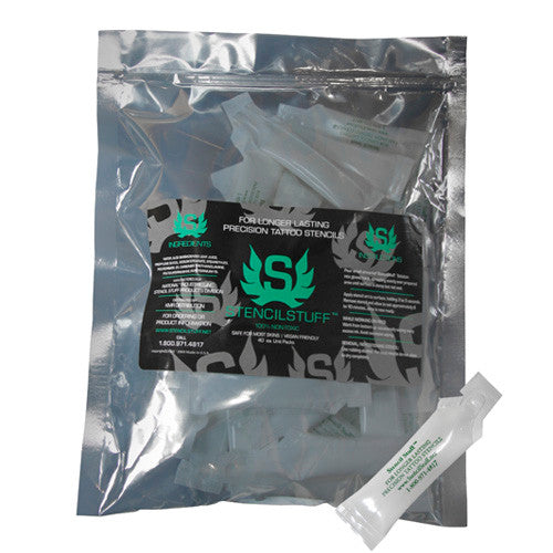Stencil StuffˆšÃ‡¬Ã† was developed in 2005 by Mario Rosenau, a professional tattoo artist who knew there had to be a better way to apply detailed, precision stencils and achieve longer lasting tattoo stencil artwork. The Original Tattoo Stencil Solution was then created! Some homemade solutions worked with some success and were improved upon by experimentation and taken to a whole new level with the help of high caliber laboratories. Stencil StuffˆšÃ‡¬Ã† is a creamy lotion that has been laboratory formulated and tested to be non-toxic and safe for most skins. Stencil StuffˆšÃ‡¬Ã† makes the tattoo stencil transfer crisper, cleaner and sharper than using all other traditional methods and eliminates the possibility of cross-contamination. Stencil StuffˆšÃ‡¬Ã† eliminates the need to bloodline or grey line. It also works exceptionally well if outlining is needed or desired for your tattoo. Stencil StuffˆšÃ‡¬Ã† has become a necessity in the tattoo industry, used by thousands of professional tattoo artists everyday. Try Stencil StuffˆšÃ‡¬Ã† one time and you'll wonder how you ever got by without it! 40 Unit Packs - same amazing solution that comes in the 4oz/8oz Work station bottle but individually packed in convenient packs Comes with 40 Unit Packs with about 4ml per bag for individual use or multiple applications. Each has a self-closing metering channel so no waste. Ideal for shop owners or artists traveling to events or guest spots