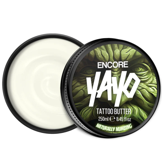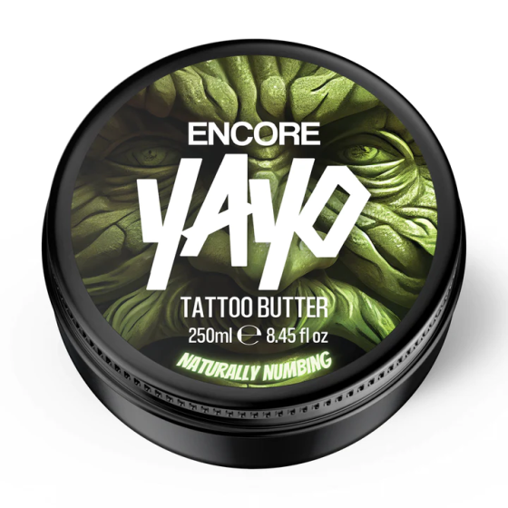 CAN I GET AN ENCORE? DO YOU WANT MORE? YAYO Encore is bulging with the raw natural power of clove oil and bergamot, two essential oils that deliver a huge numbing punch for those with topical discomfort (such as getting a tattoo). If you're looking for an alternative to the over the counter (and some not so over the counter) numbing products for during the tattoo then this is the OG you've been looking for. Designed by the master butteratiers at YAYO HQ, to give you the same top tier high quality tattoo butter but with a little nip extra of sweet sweet numbing goodness. Ladies and gentlemen, can I get an ENCORE! ABOUT THIS PRODUCT: Clove & Bergamot Scented Moisturising & Soft Formulation Packed full of Vitamin E Ideal for use on all skin types Designed to heal the epidermis quickly Ensures a bright and vibrant healed tattoo Fit for use during and after the tattoo process 100% Vegan Standard and Supercharged 1000mg options available Ingredients: Hydrogenated Soybean Oil, Persea Gratissima Oil (Avocado Butter) Brassica Campestris (Rapeseed) Tocopherol (Vitamin E) Seed Oil Syzygium aromaticum (Clove oil) Citrus bergamia (Bergamot oil) Eugenol, Citral, Limonene, Linalool (naturally present in essential oils) FOR EXTERNAL USE ONLY Avoid contact with eyes and other sensitive areas of the body. If contact occurs, wash the affected area. If irritation occurs discontinue use.
