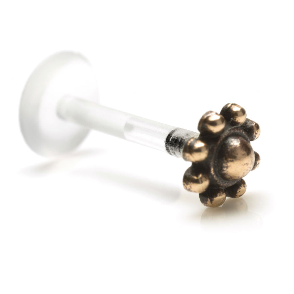 Ornate Rose Bronze Attachment on Plastic Labret - Internal push in Gauge: 1.2mm / 16g Length: 6mm or 8mm Attachment Size: 6mm (approx) Not for initial piercing, only to be worn in healed piercings