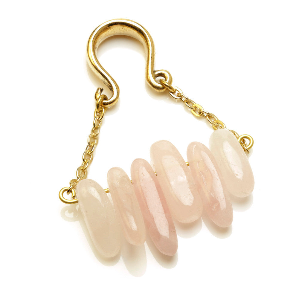 Rose Quartz Pendent Ear Weight Gauge: 3mm (8ga), 4mm (6ga)Approx Weight: 13.9gmOverall Height / Drop: 60mmGems on Bar Size: 35mm x 25mmSadlebar with chain (will hang through tunnel or ear)(Some believe Rose Quartz can be worn to attract love and to relaxation)
