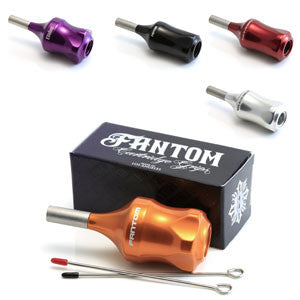 Size: 25mm or 30mm - Anodized for strength and finish Colours: Black, Grey, Orange, Pink, Purple, Red, Silver Machined out of aircraft aluminum using a 5 axis CNC machine Hand polished for an ultra smooth finish Autoclavable Back stem is made from medical grade stainless steel with a satin finish FANTOM tubes will fit all standard coil or rotary machines Lightweight grip gives the overall feel of weightlessness - great for wrist health Compatible with T-TECH or HAWK cartridges Custom Ergo-Designed grip gives the most comfortable and natural feel